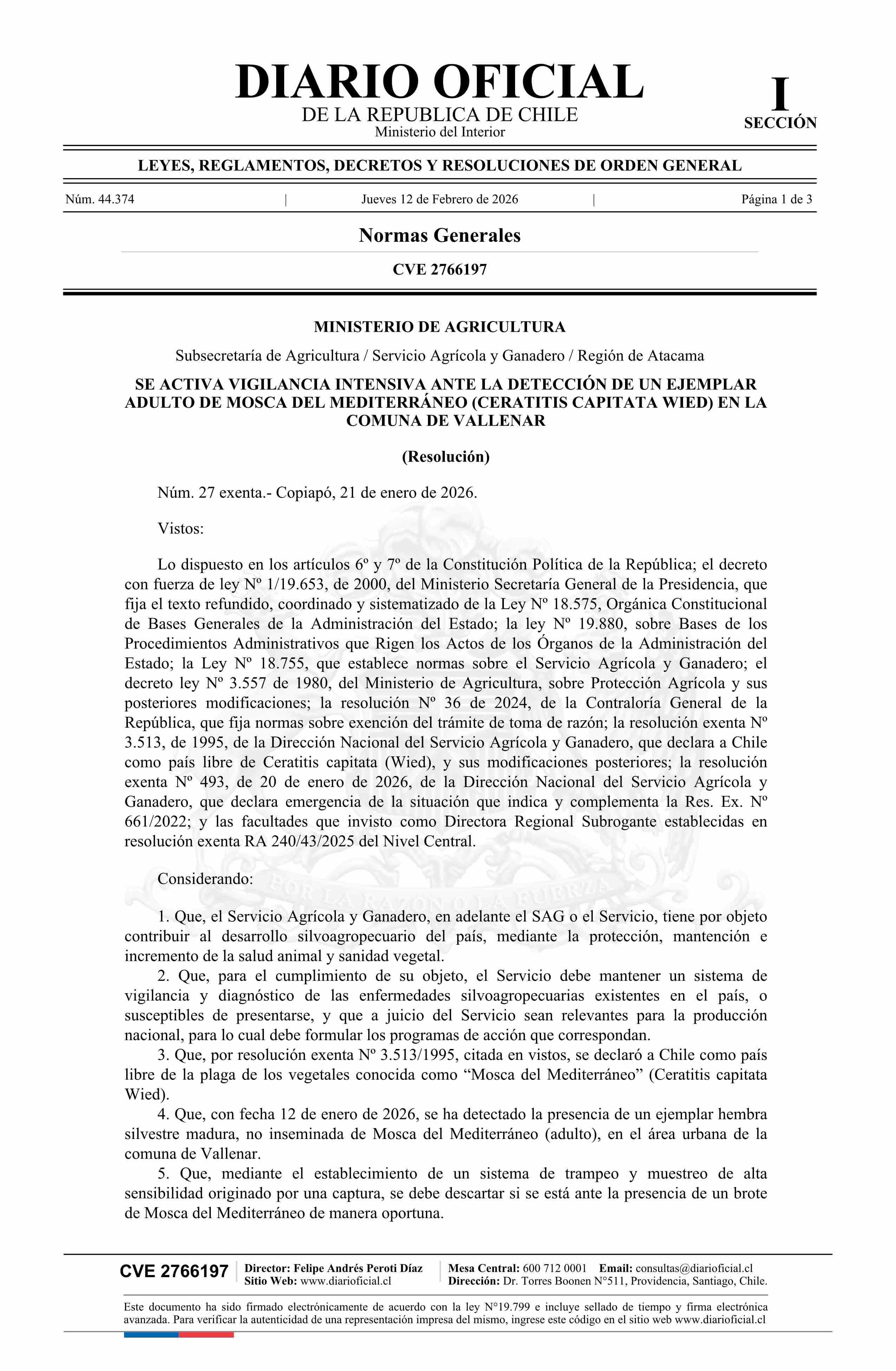 Resolución exenta número 27, de 2026.- Activa vigilancia intensiva ante la detección de un ejemplar adulto de Mosca del Mediterráneo (Ceratitis capitata Wied.) en la comuna de Vallenar 12-02-2026 Diario Oficial Edición Electrónica |