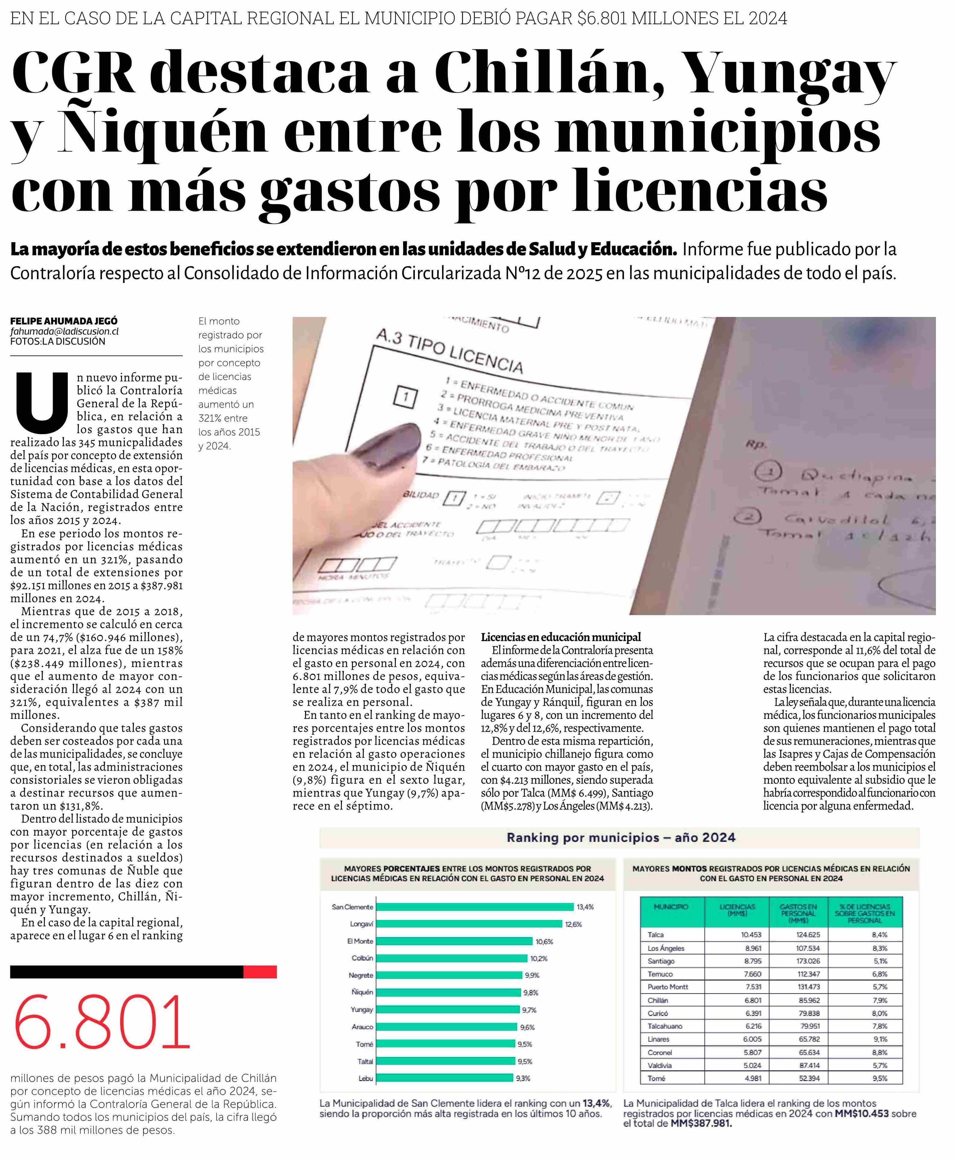 CGR destaca a Chillán, Yungay y Ñiquén entre los municipios con más gastos por licencias 25-06-2025 La Discusión |