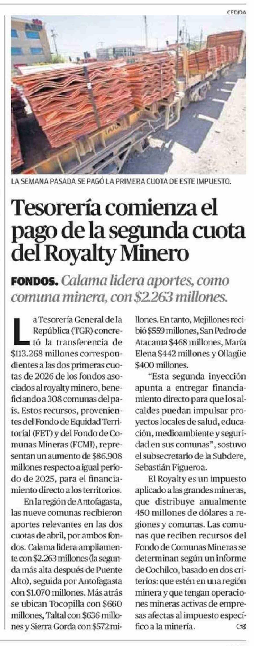 Título: Tesorería comienza el pago de la segunda cuota del Royalty Minero