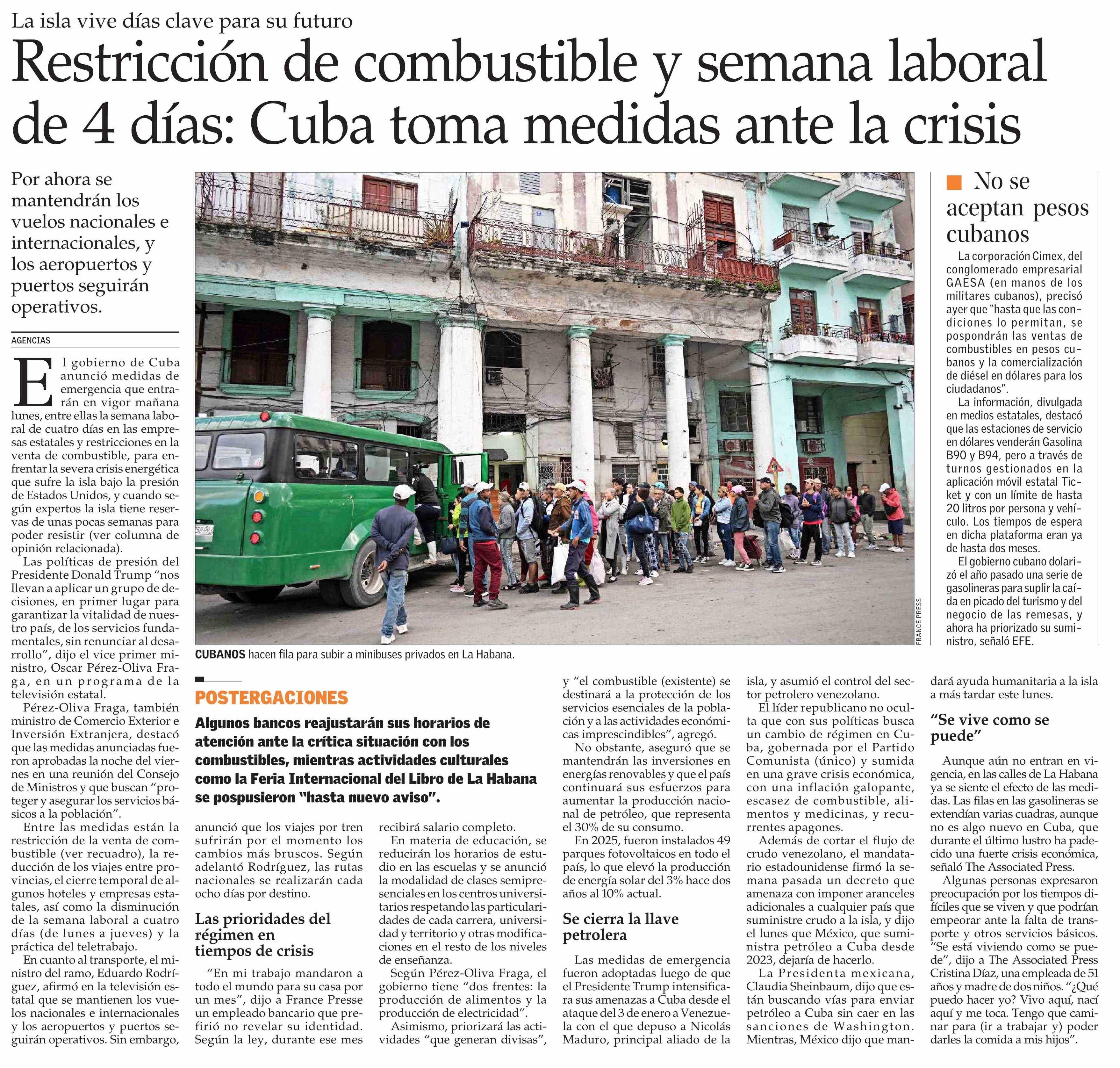 Restricción de combustible y semana laboral de 4 días: Cuba toma medidas ante la crisis 08-02-2026 El Mercurio |