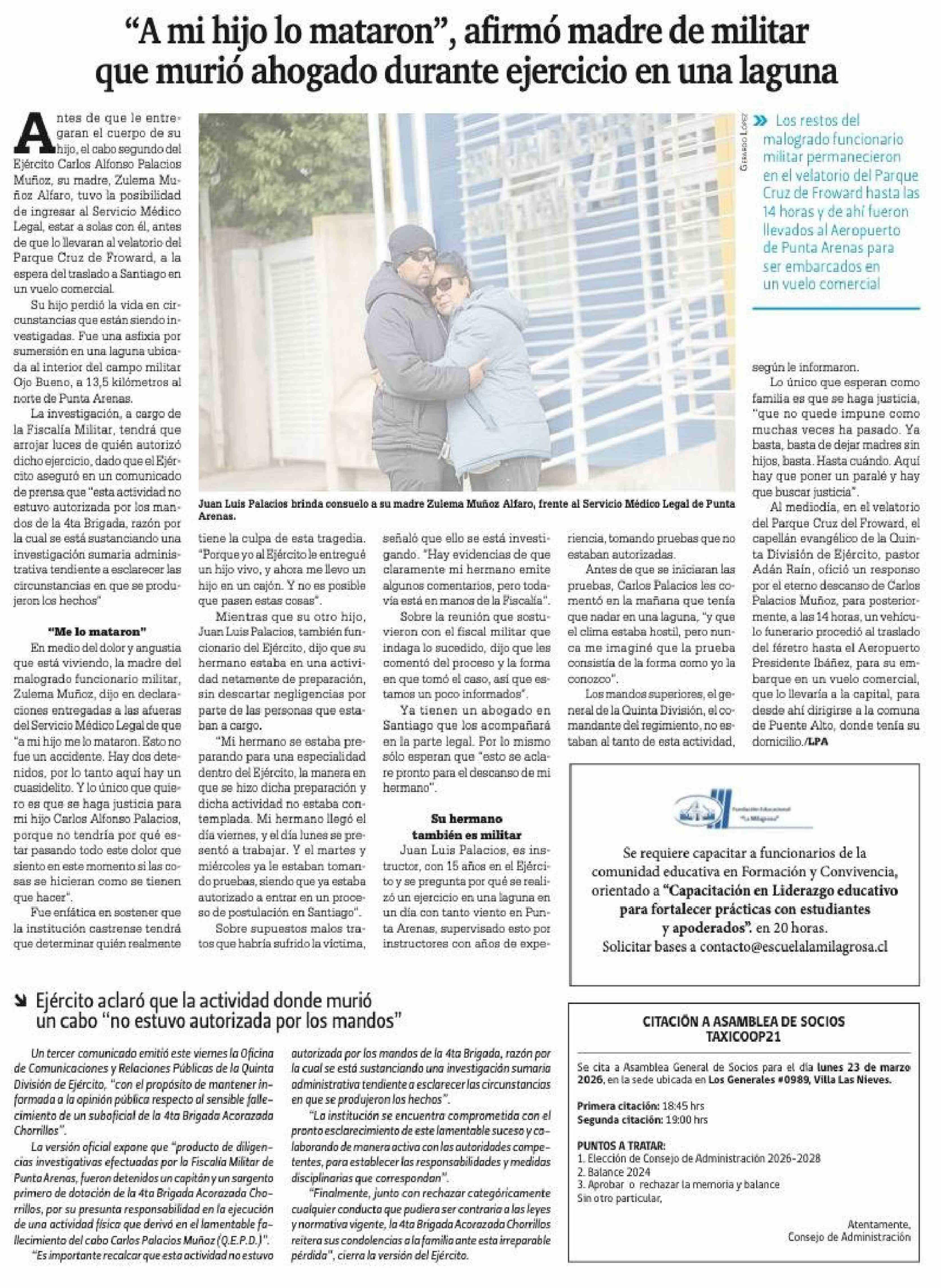 "A mi hijo lo mataron", afirmó madre de militar que murió ahogado durante ejercicio en una laguna 07-03-2026 La Prensa Austral |