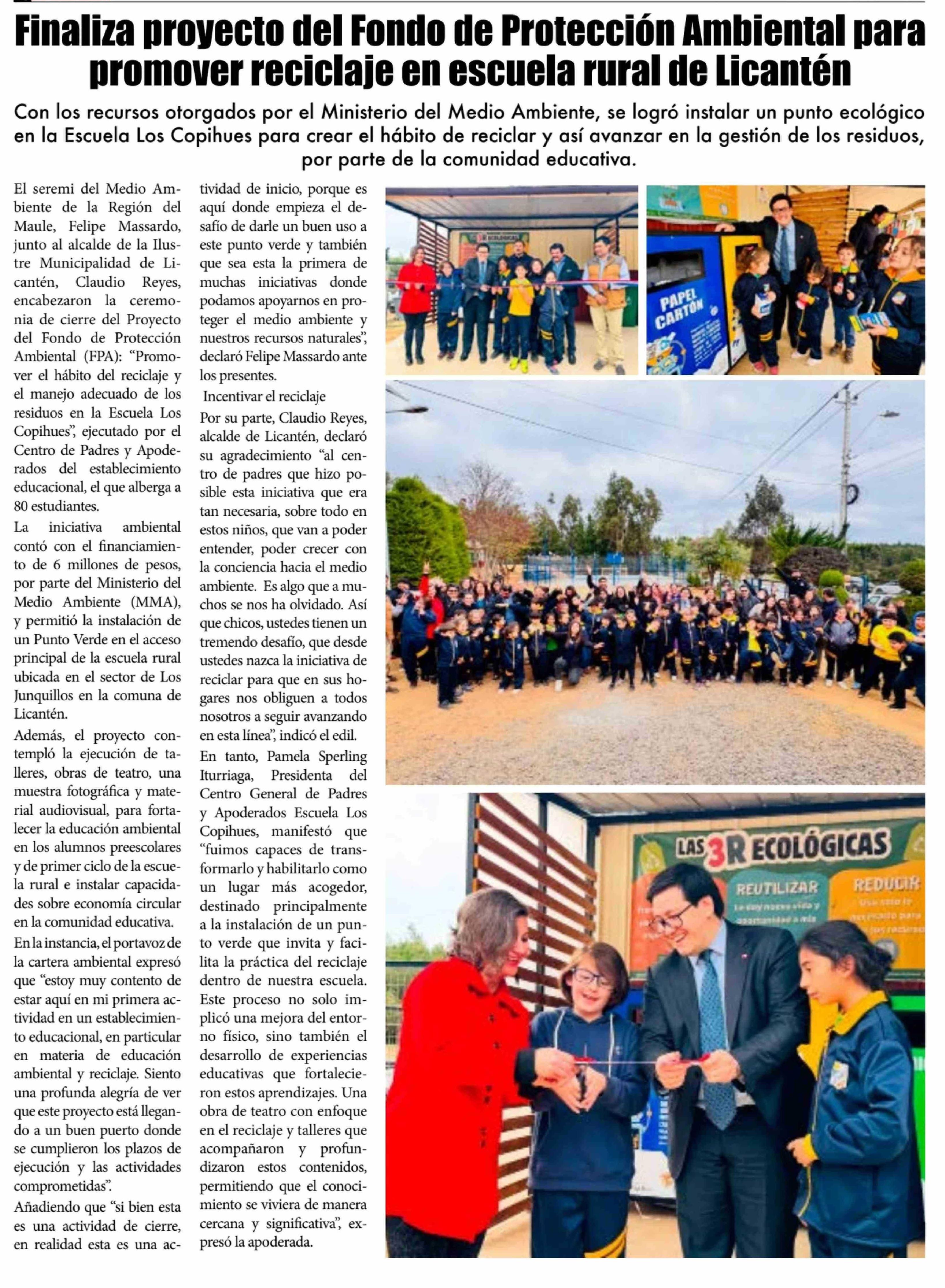 Título: Finaliza proyecto del Fondo de Protección Ambiental para promover reciclaje en escuela rural de Licantén