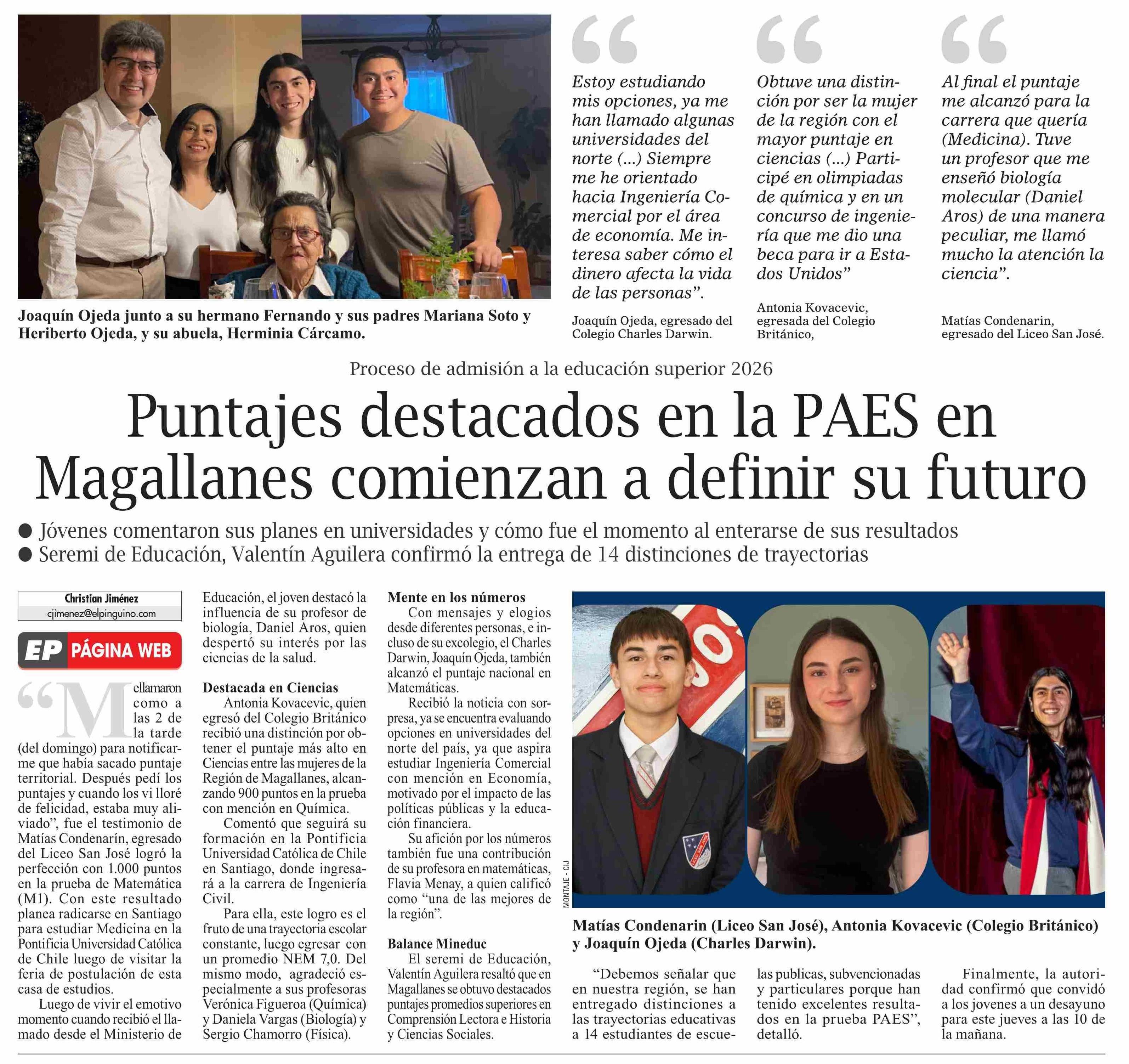 Puntajes destacados en la PAES en Magallanes comienzan a definir su futuro 06-01-2026 El Pingüino |