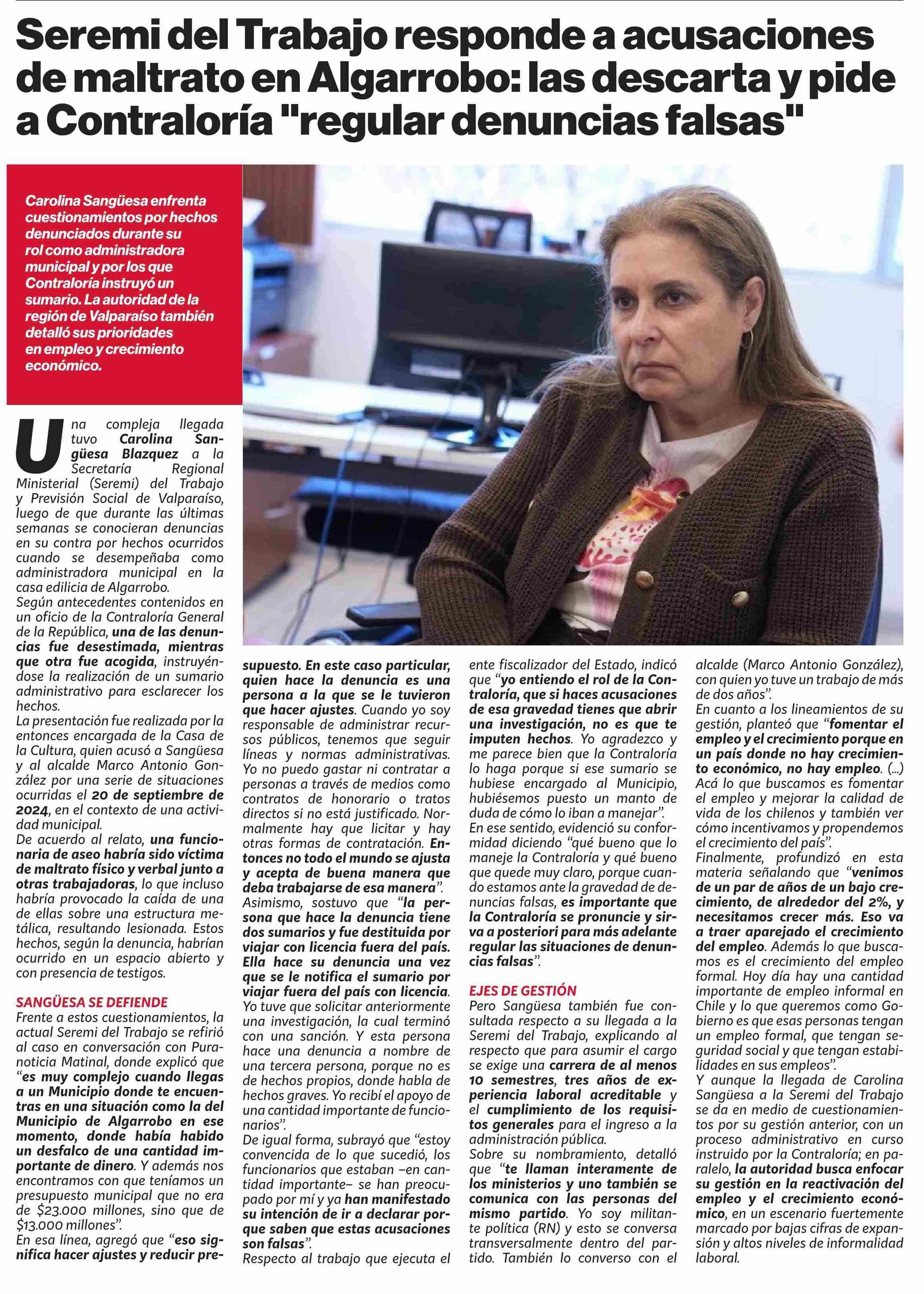 Seremi del Trabajo responde a acusaciones de maltrato en Algarrobo: las descarta y pide a Contraloría "regular denuncias falsas" 24-04-2026 Puranoticia.cl |