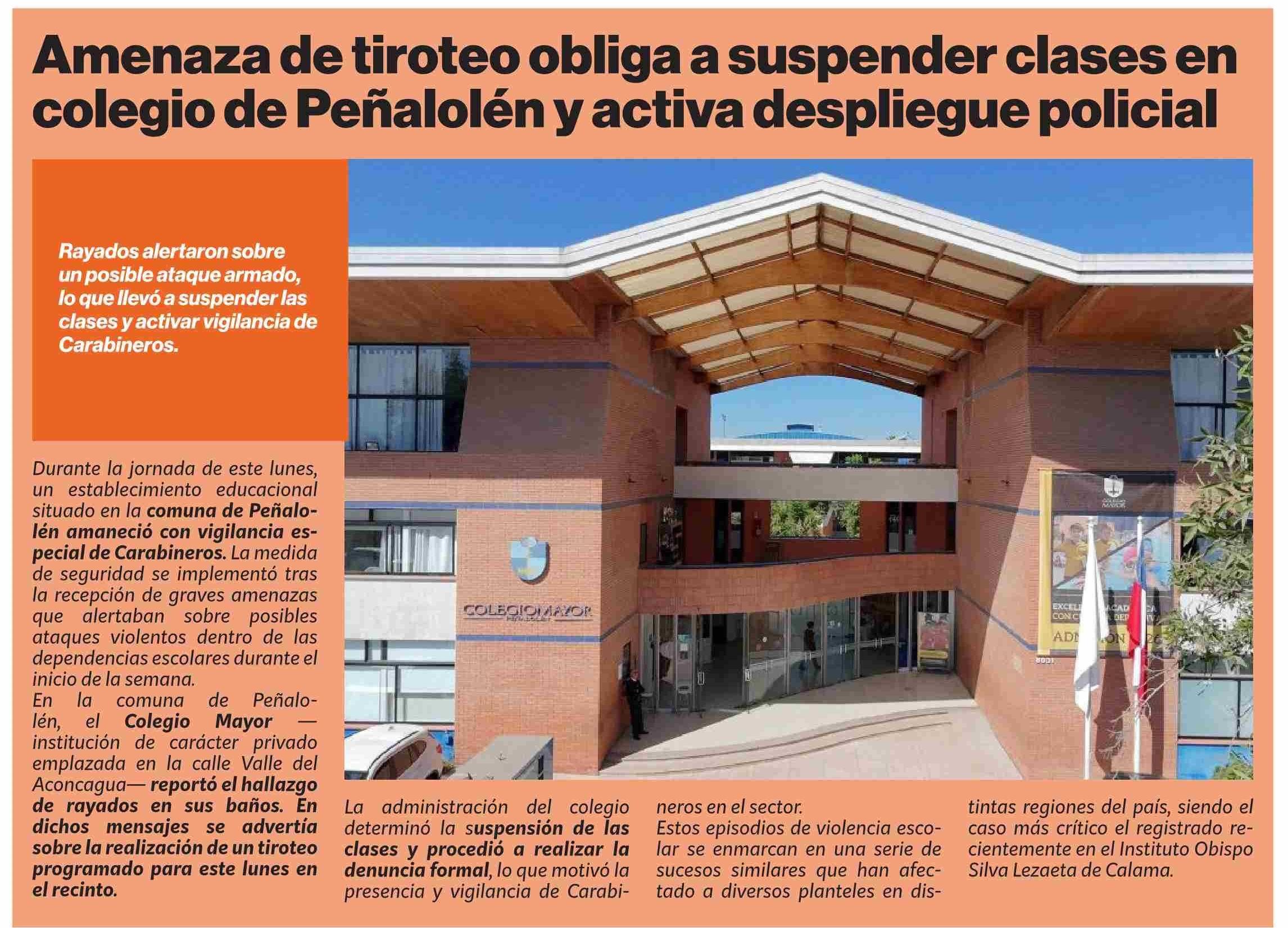 | Título: | Amenaza de tiroteo obliga a suspender clases en colegio de Peñalolén y activa despliegue policial |