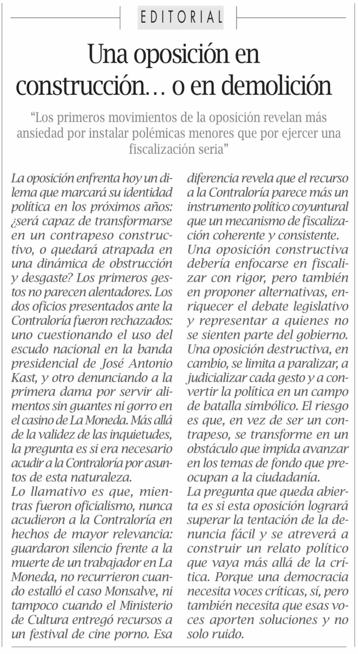 Editorial: Una oposición en construcción ... o en demolición 15-03-2026 El Pingüino |