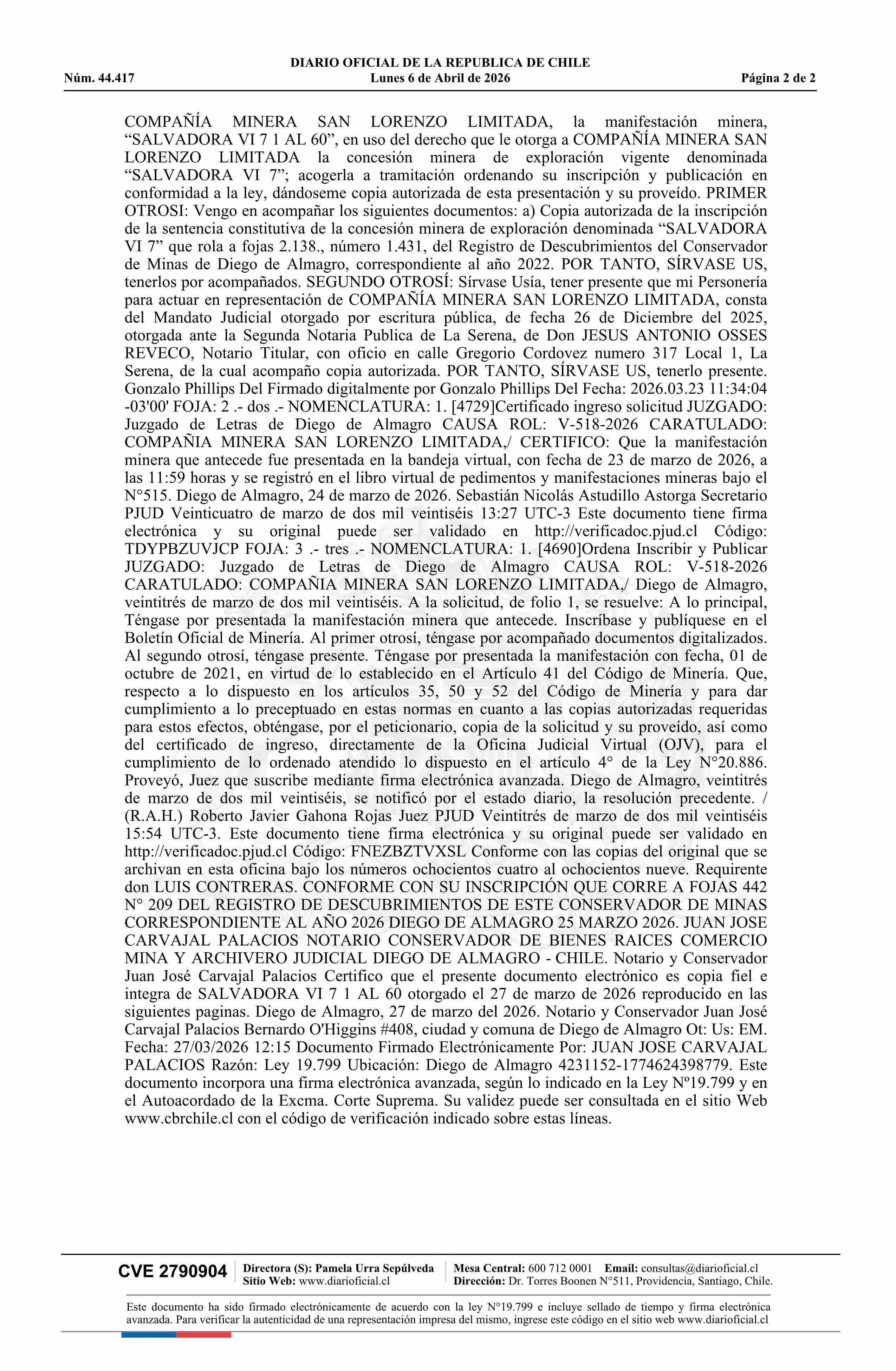 SALVADORA VI 7 1 AL 60 / Compañía Minera San Lorenzo Limitada 06-04-2026 DIARIO OFICIAL CHILE - BOLETÍN OFICIAL DE MINERÍA |