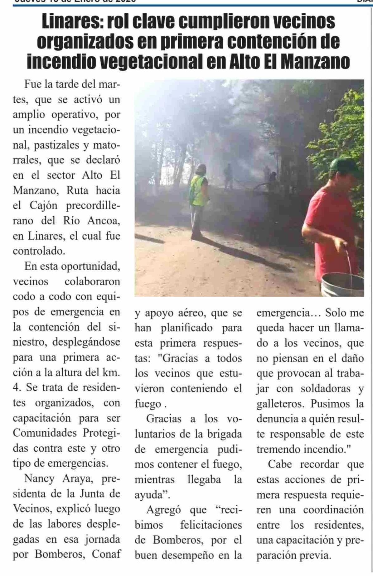 | Título: | Linares: rol clave cumplieron vecinos organizados en primera contención de incendio vegetacional en Alto El Manzano |