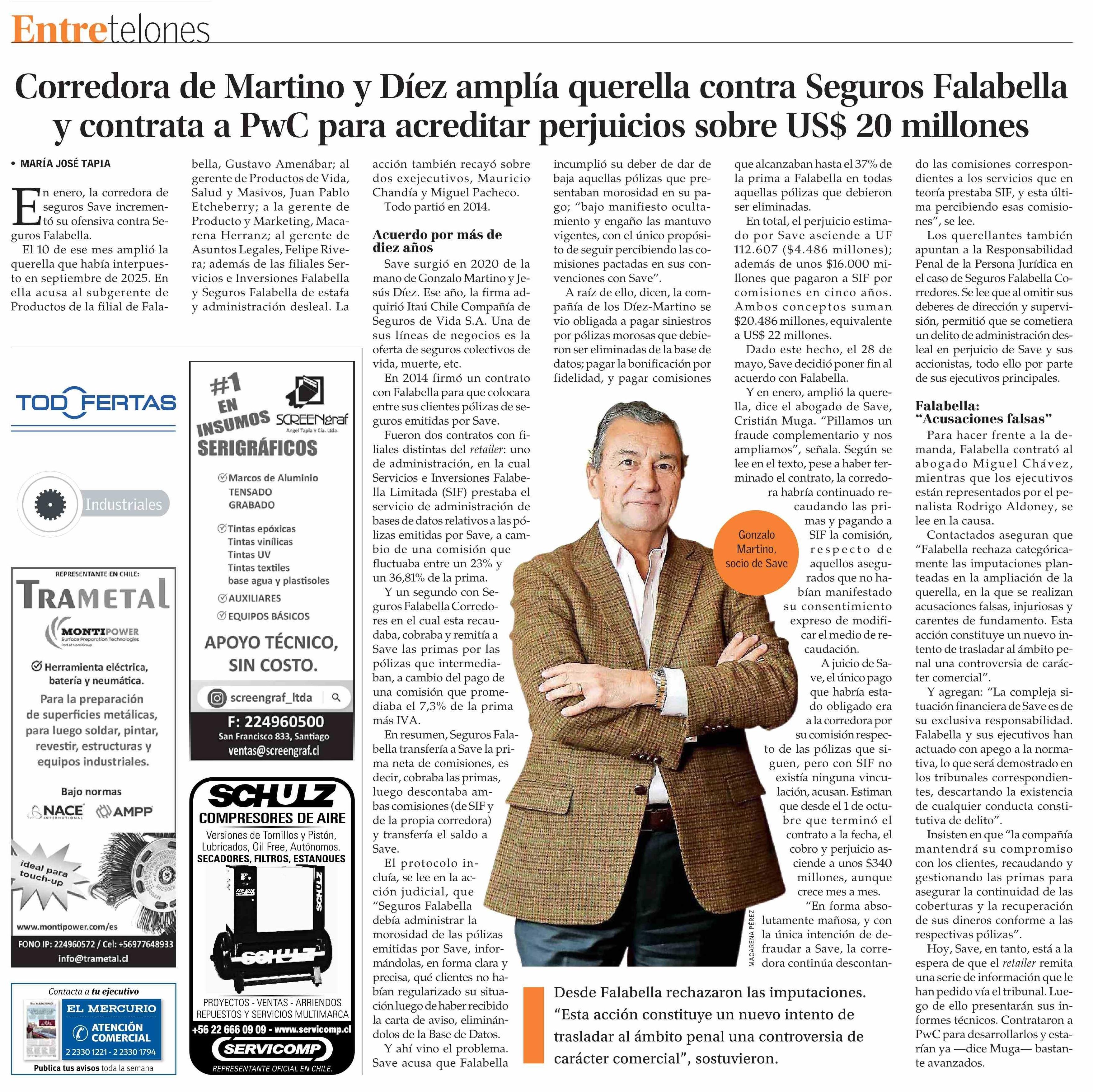Corredora de Martino y Díez amplía querella contra Seguros Falabella y contrata a PwC para acreditar perjuicios sobre US$ 20 millones 22-03-2026 El Mercurio |