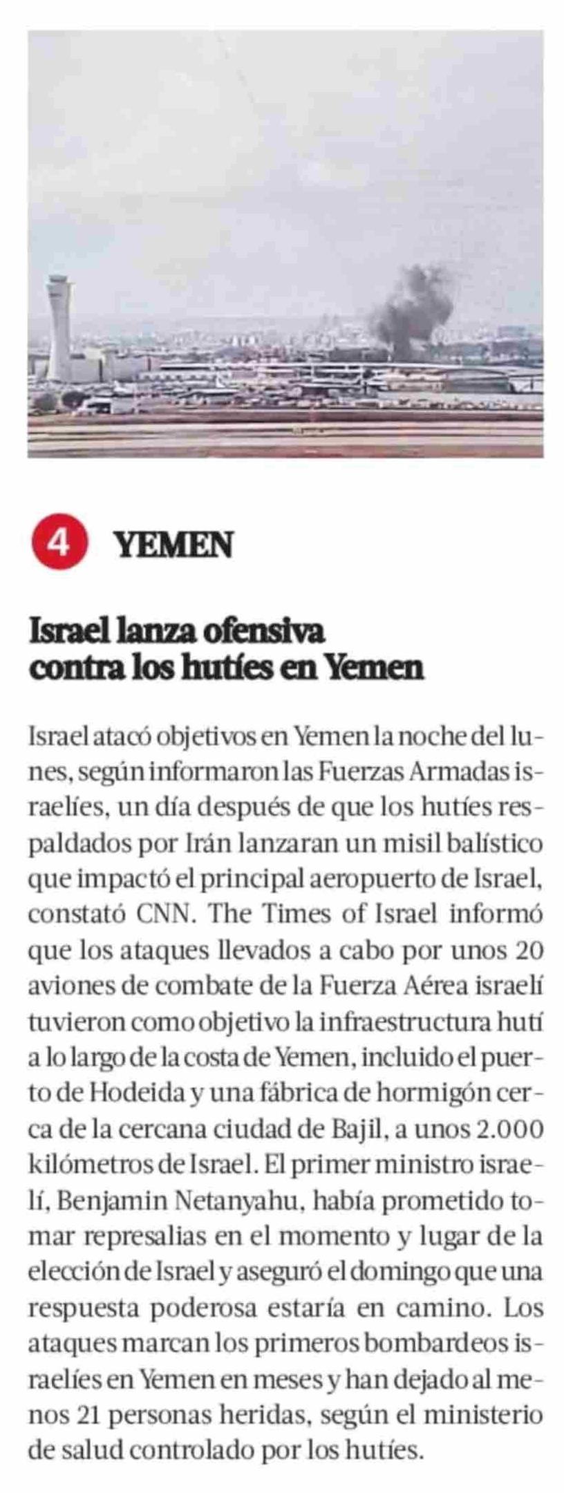 | Título: | Israel atacó objetivos en Yemen la noche del lunes, según informaron las Fuerzas Armadas israelíes, un día después de que los hutíes respaldados por Irán lanzaran un misil balístico que impactó el principal aeropuerto de Israel, constató CNN. The Times of Israel informó que los ataques llevados a ca |