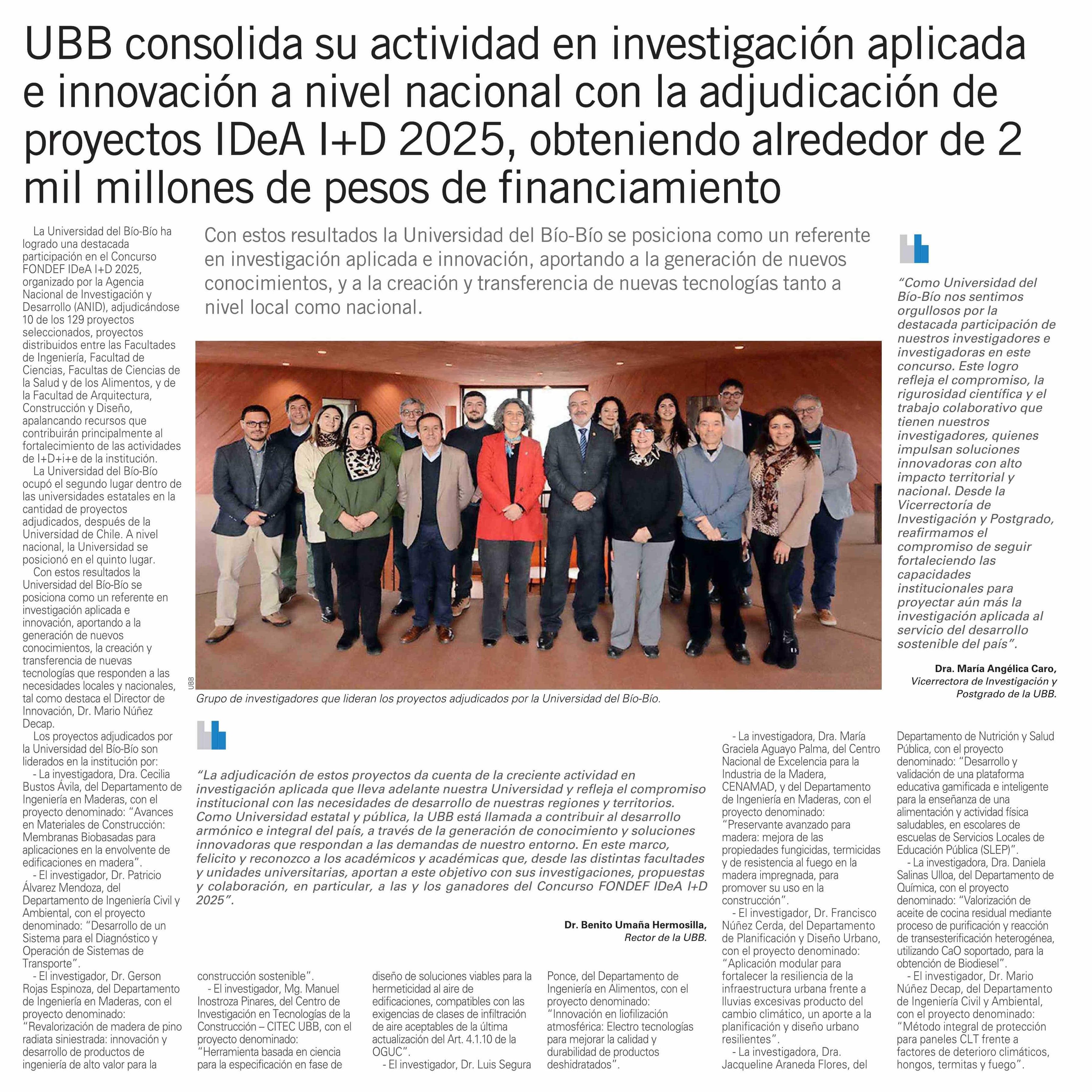 | Título: | UBB consolida su actividad en investigación aplicada e innovación a nivel nacional con la adjudicación de proyectos IDeA |+D 2025, obteniendo alrededor de 2 mil millones de pesos de financiamiento |