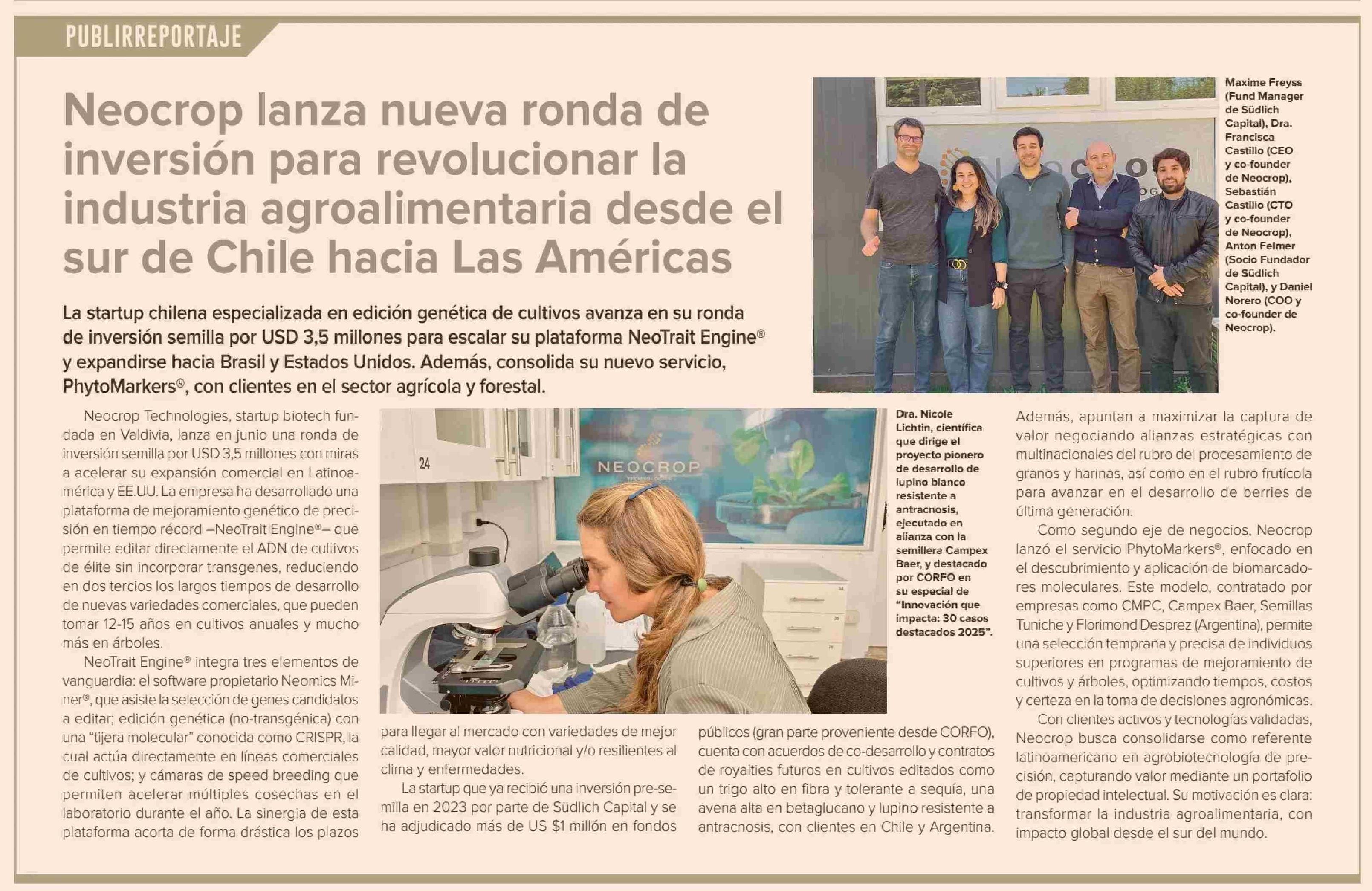 Neocrop lanza nueva ronda de inversión para revolucionar la industria agroalimentaria desde el sur de Chile hacia Las Américas 03-06-2025 Diario Financiero |