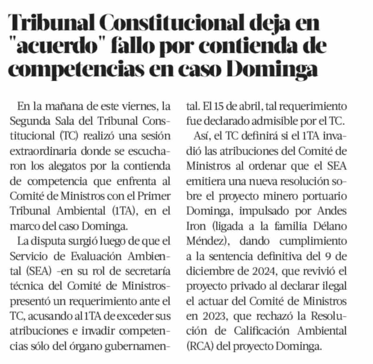 Tribunal Constitucional deja en "acuerdo" fallo por contienda de competencias en caso Dominga 31-05-2025 La Tercera |