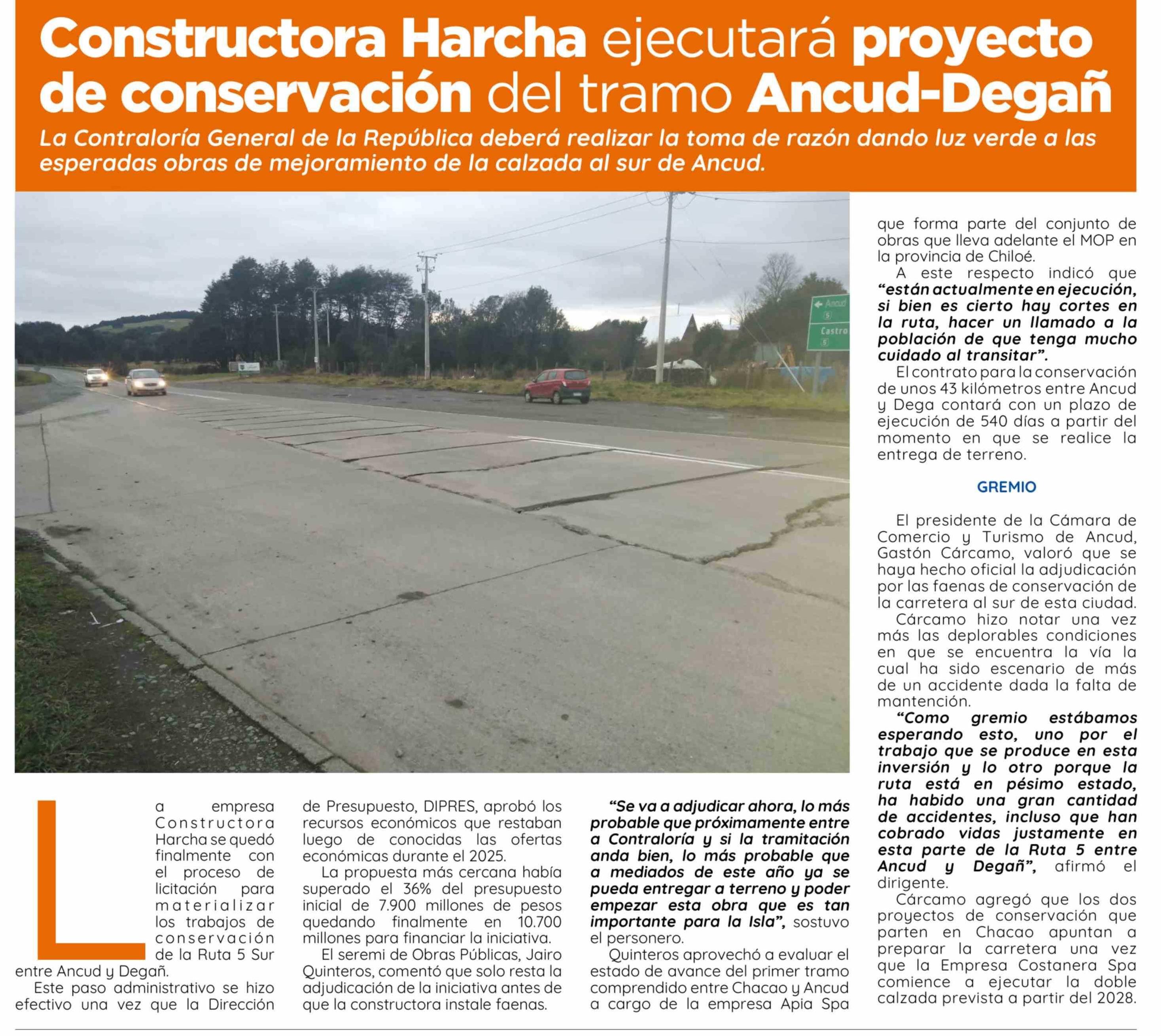 Título: Constructora Harcha ejecutará proyecto de conservación del tramo Ancud-Degañ