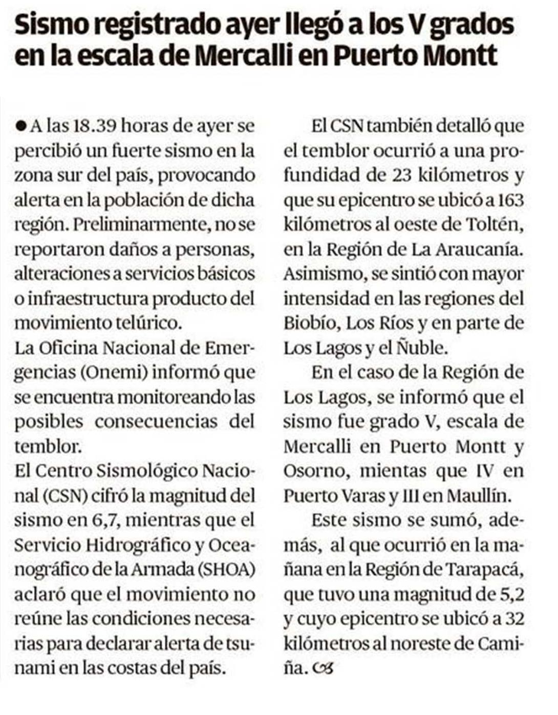 | Título: | Sismo registrado ayer llegó a los V grados en la escala de Mercalli en Puerto Montt |