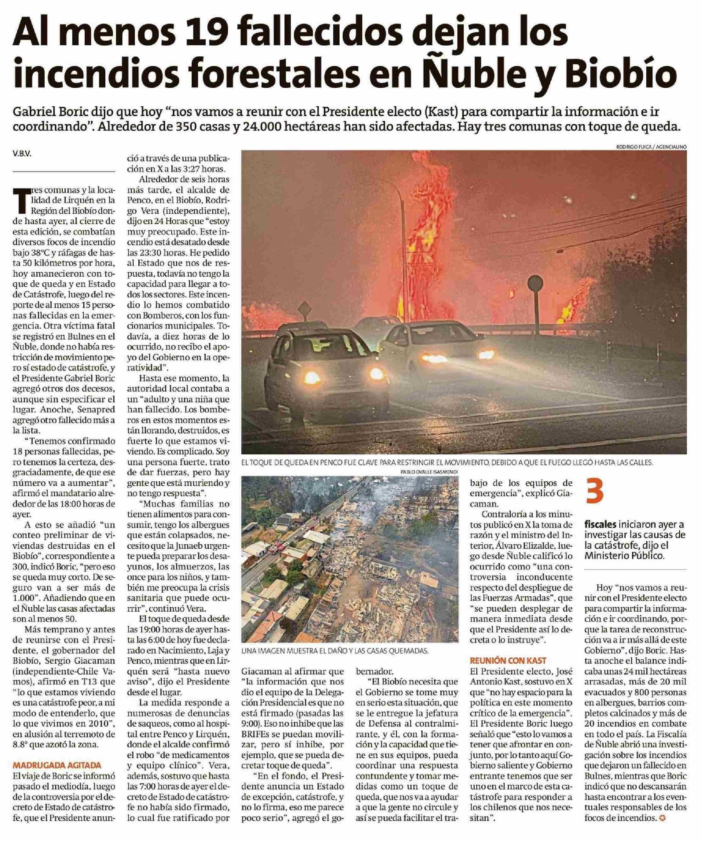 | Título: | Al menos 19 fallecidos dejan los incendios forestales en Nuble y Biobio |
