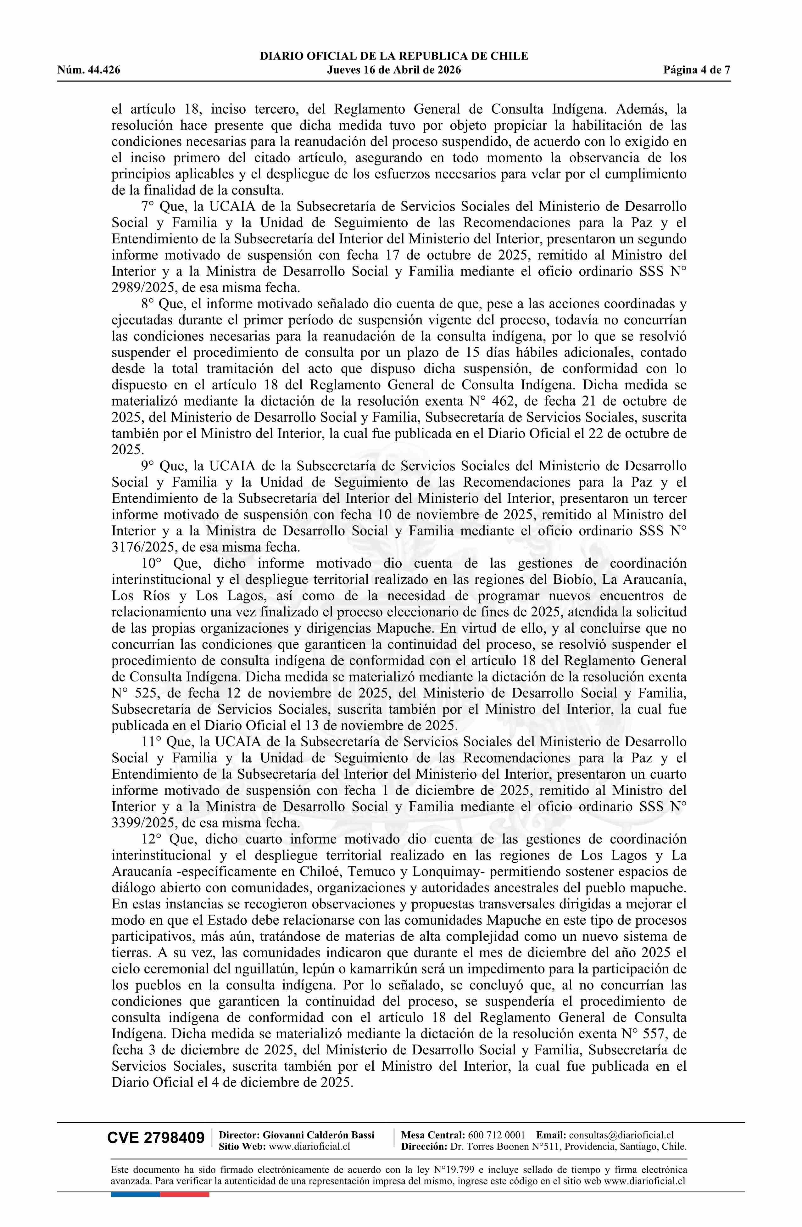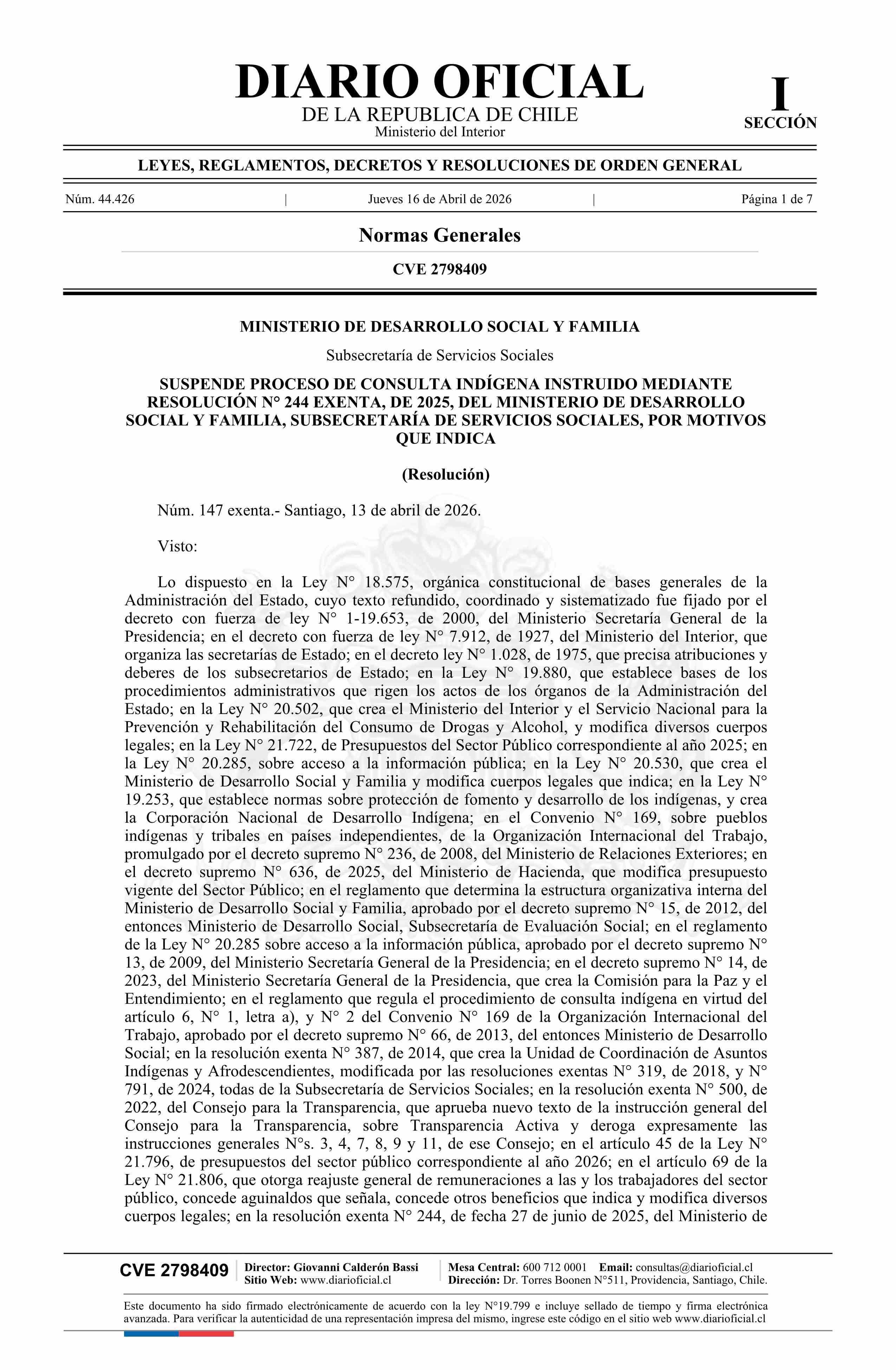 Resolución exenta número 147, de 2026.- Suspende proceso de consulta indígena instruido mediante resolución N° 244 exenta, de 2025, por motivos que indica 16-04-2026 Diario Oficial Edición Electrónica |
