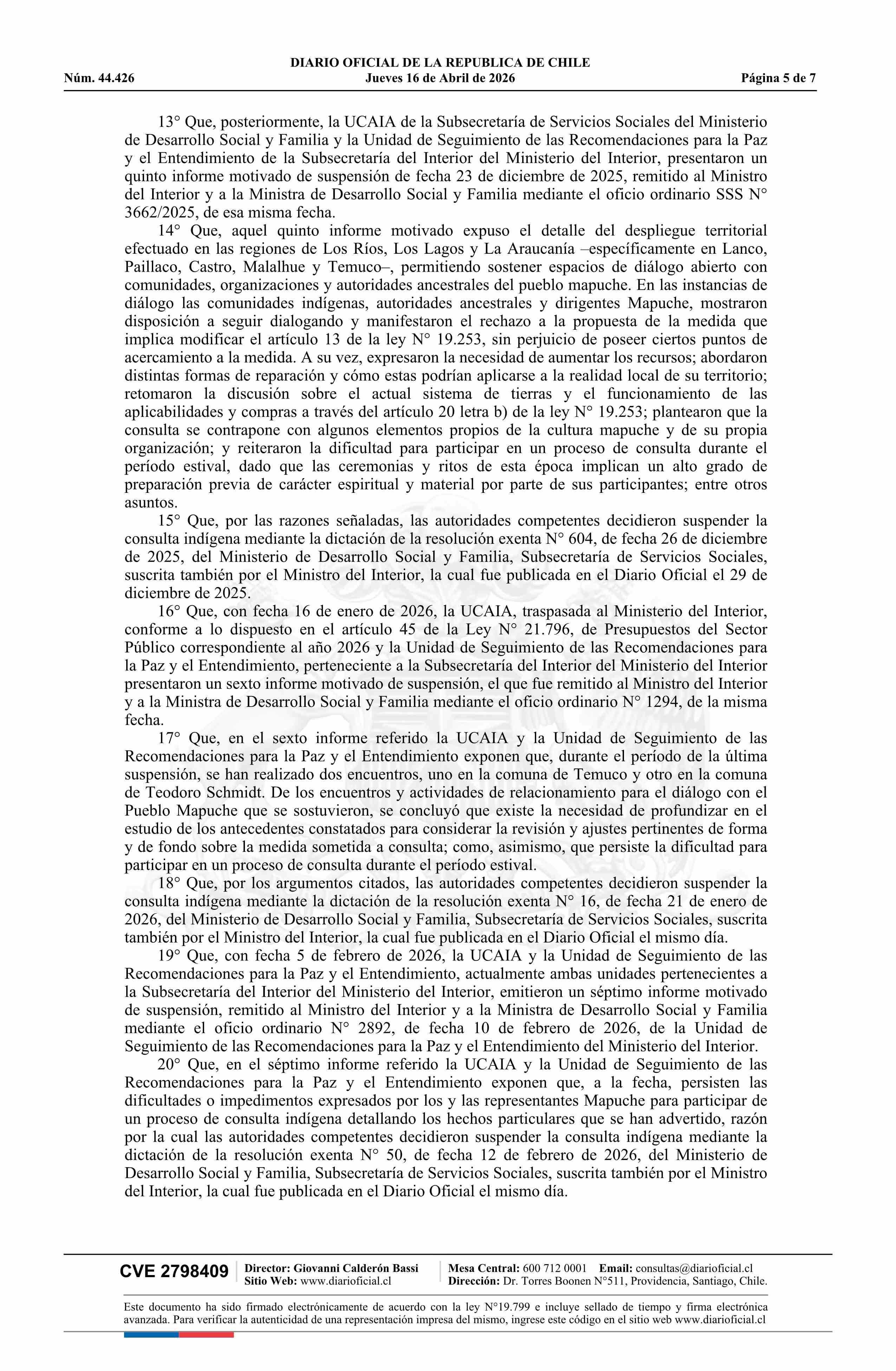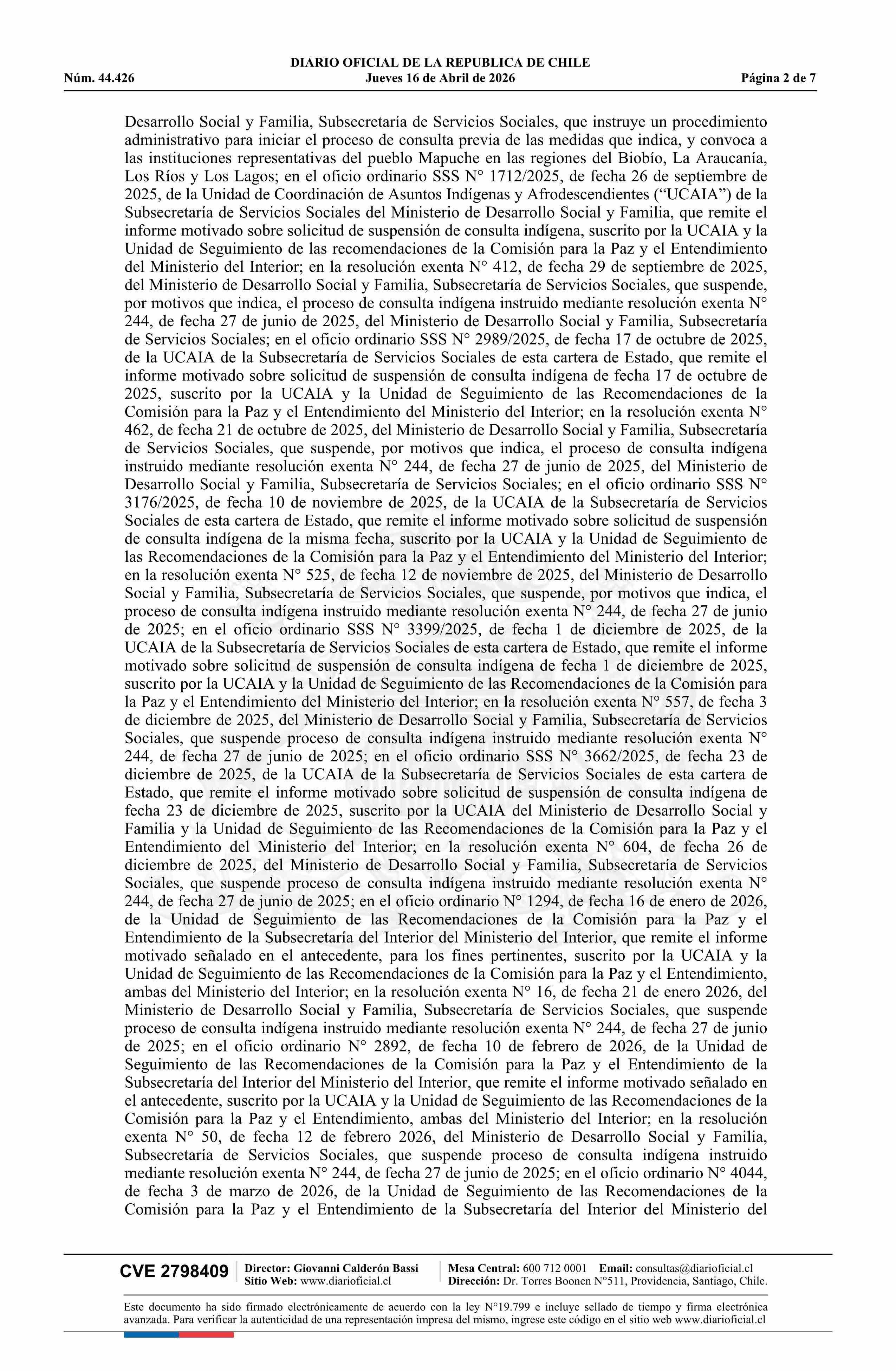 | Título: | Resolución exenta número 147, de 2026.- Suspende proceso de consulta indígena instruido mediante resolución N° 244 exenta, de 2025, por motivos que indica |