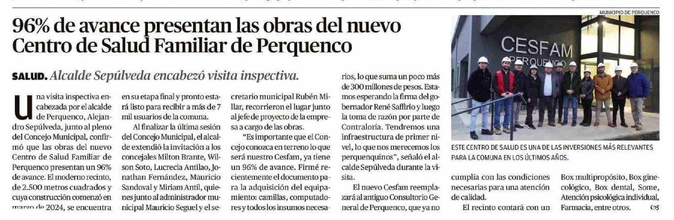 Título: 96% De avance presentan las obras del nuevo Centro de Salud Familiar de Perquenco