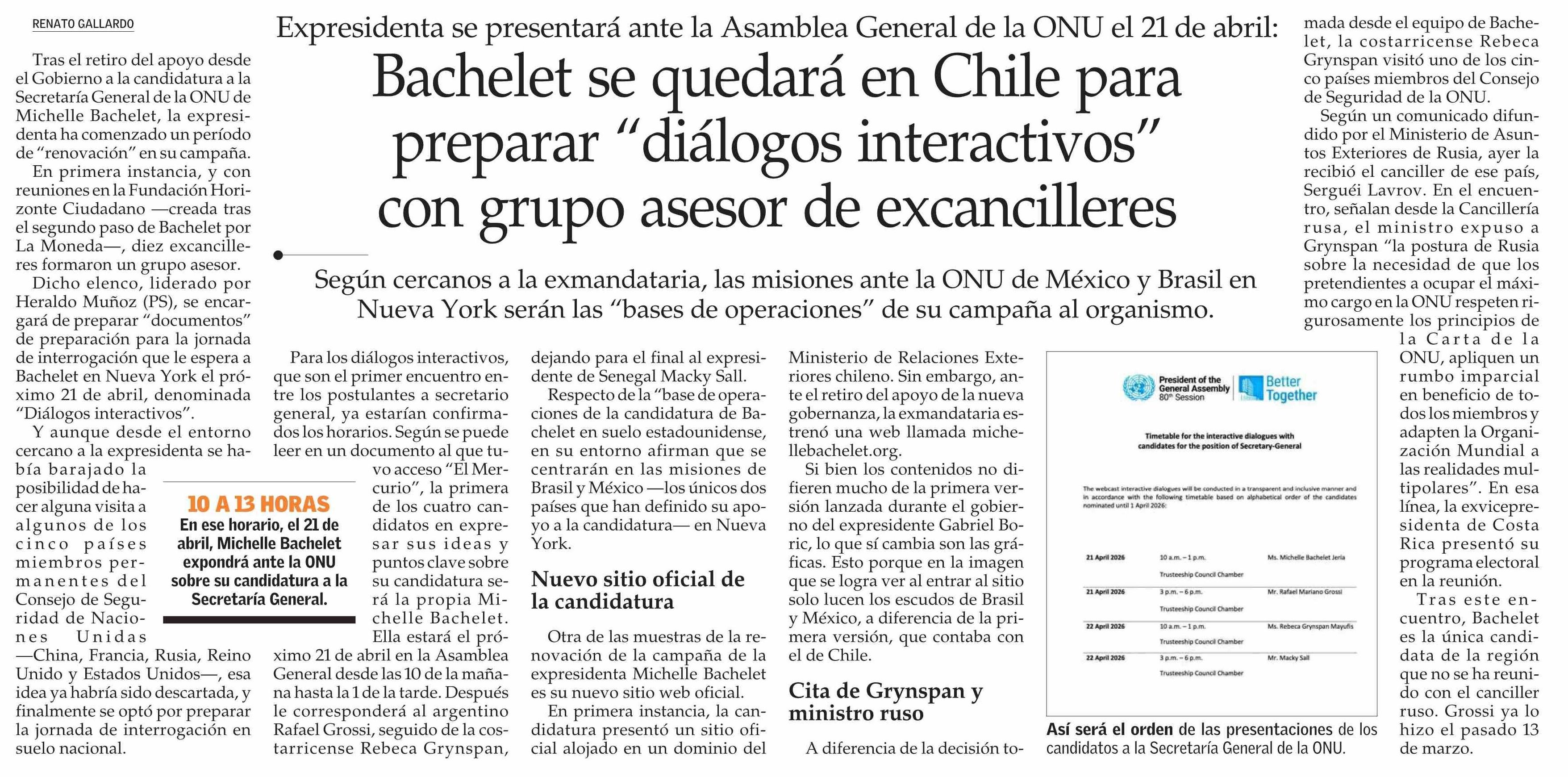 Título: Bachelet se quedará en Chile para preparar “diálogos interactivos” con grupo asesor de excancilleres