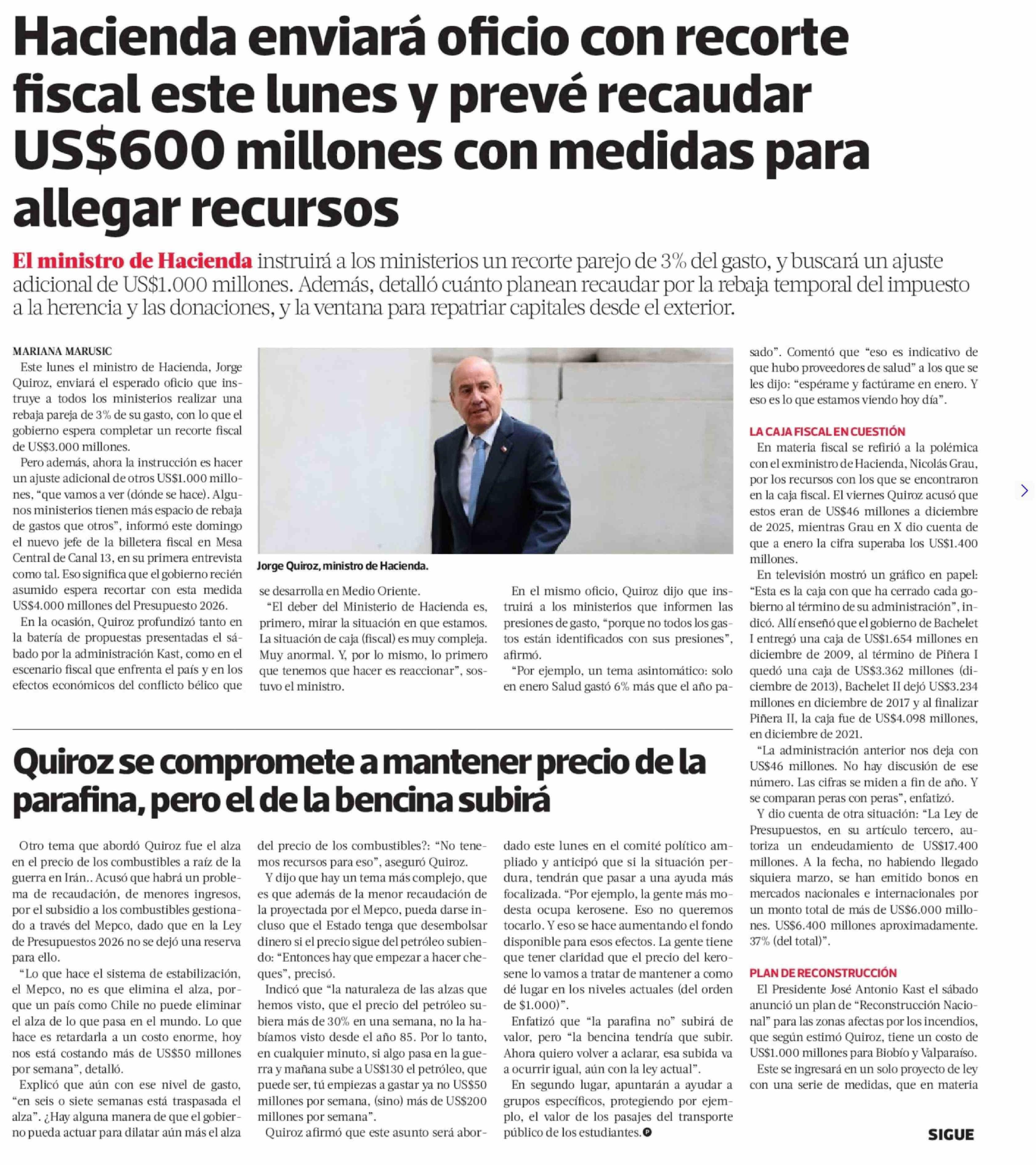 Hacienda enviará oficio con recorte fiscal este lunes y prevé recaudar US$600 millones con medidas para allegar recursos 16-03-2026 La Tercera |