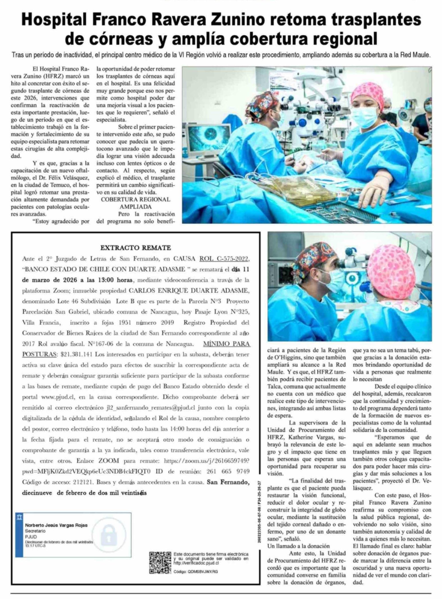 Hospital Franco Ravera Zunino retoma trasplantes de córneas y amplía cobertura regional 26-02-2026 Diario VI Región |