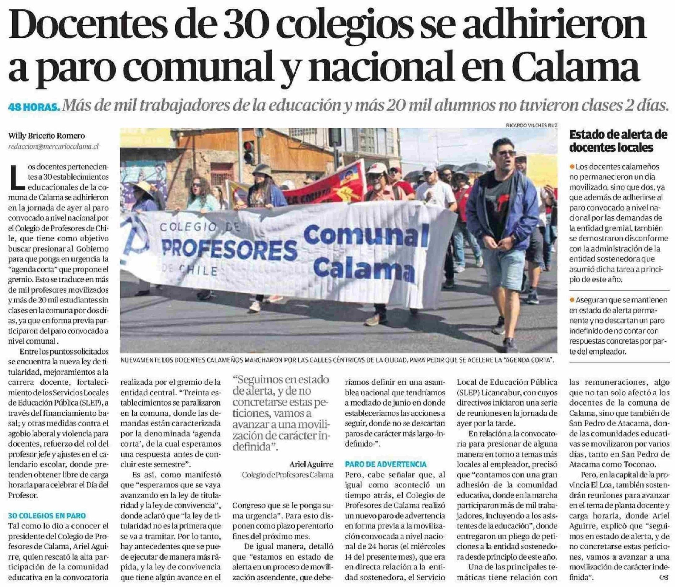 Docentes de 30 colegios se adhirieron a paro comunal y nacional en Calama 16-05-2025 El Mercurio de Calama |