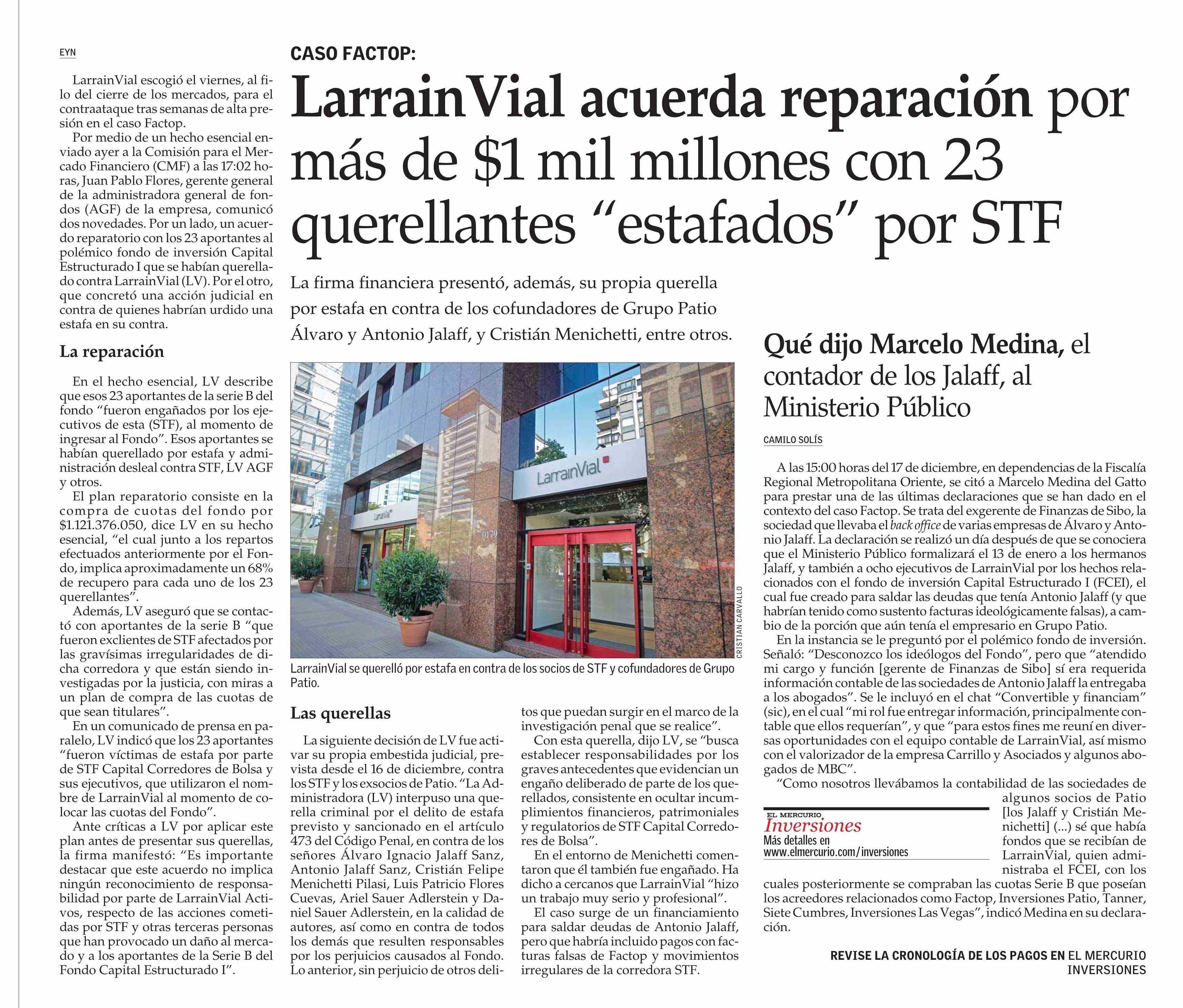 LarrainVial acuerda reparación por más de $1 mil millones con 23 querellantes “estafados” por STF 28-12-2024 El Mercurio |