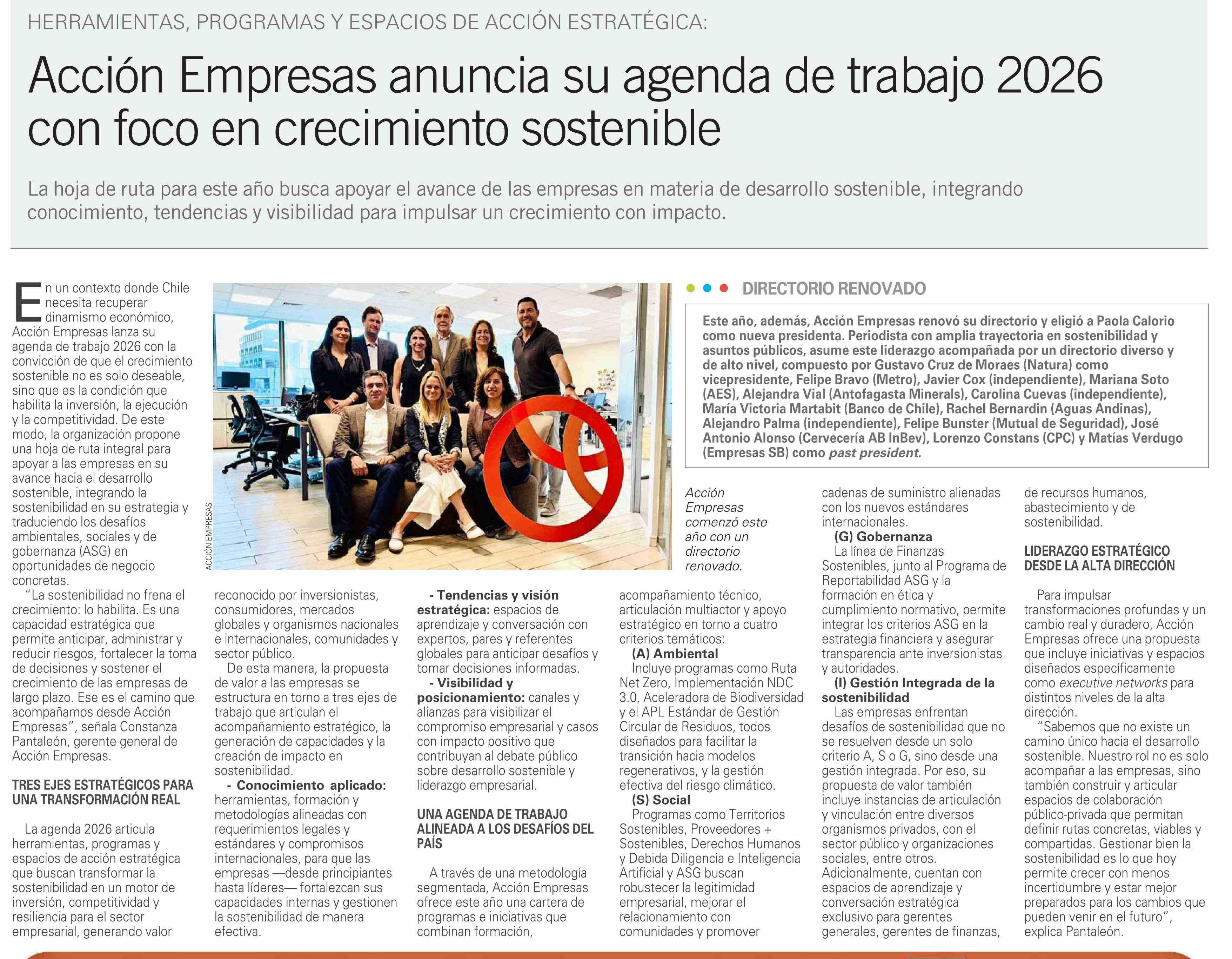 Acción Empresas anuncia su agenda de trabajo 2026 con foco en crecimiento sostenible 25-02-2026 El Mercurio |