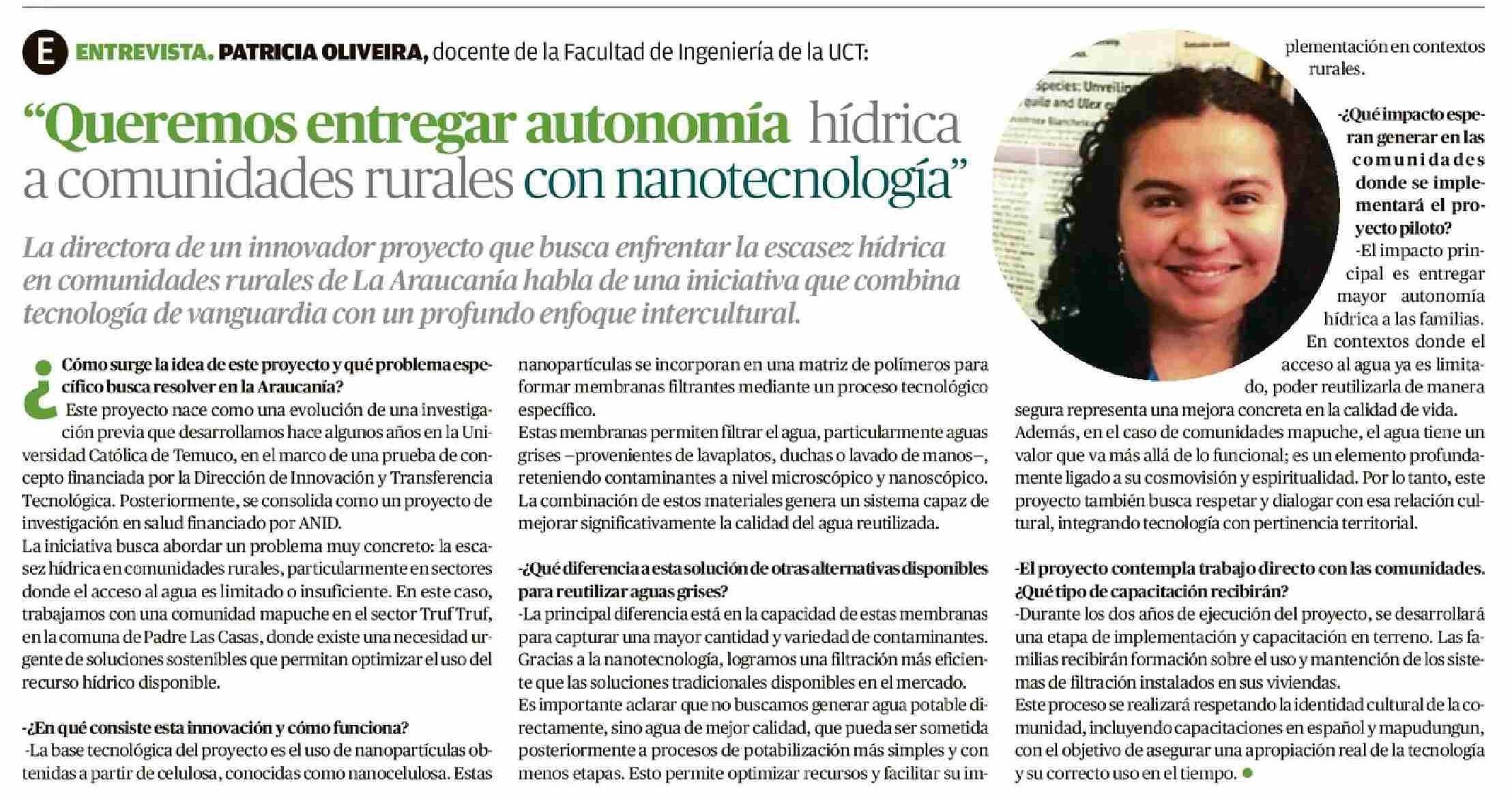 | Título: | “Queremos entregar autonomía hídrica a comunidades rurales con nanotecnología” |