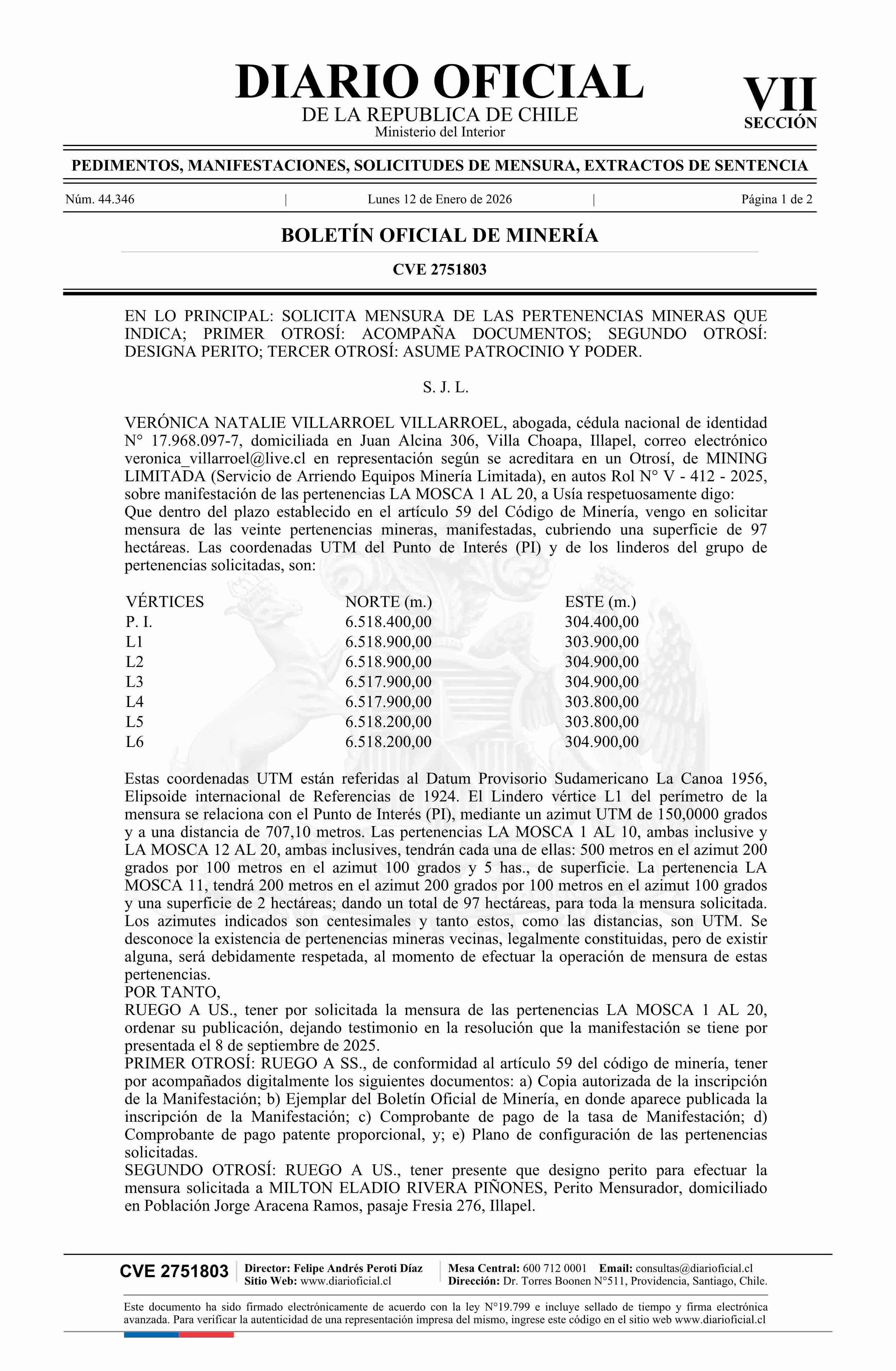 LA MOSCA 1 AL 20 / Mining Limitada 12-01-2026 DIARIO OFICIAL CHILE - BOLETÍN OFICIAL DE MINERÍA |
