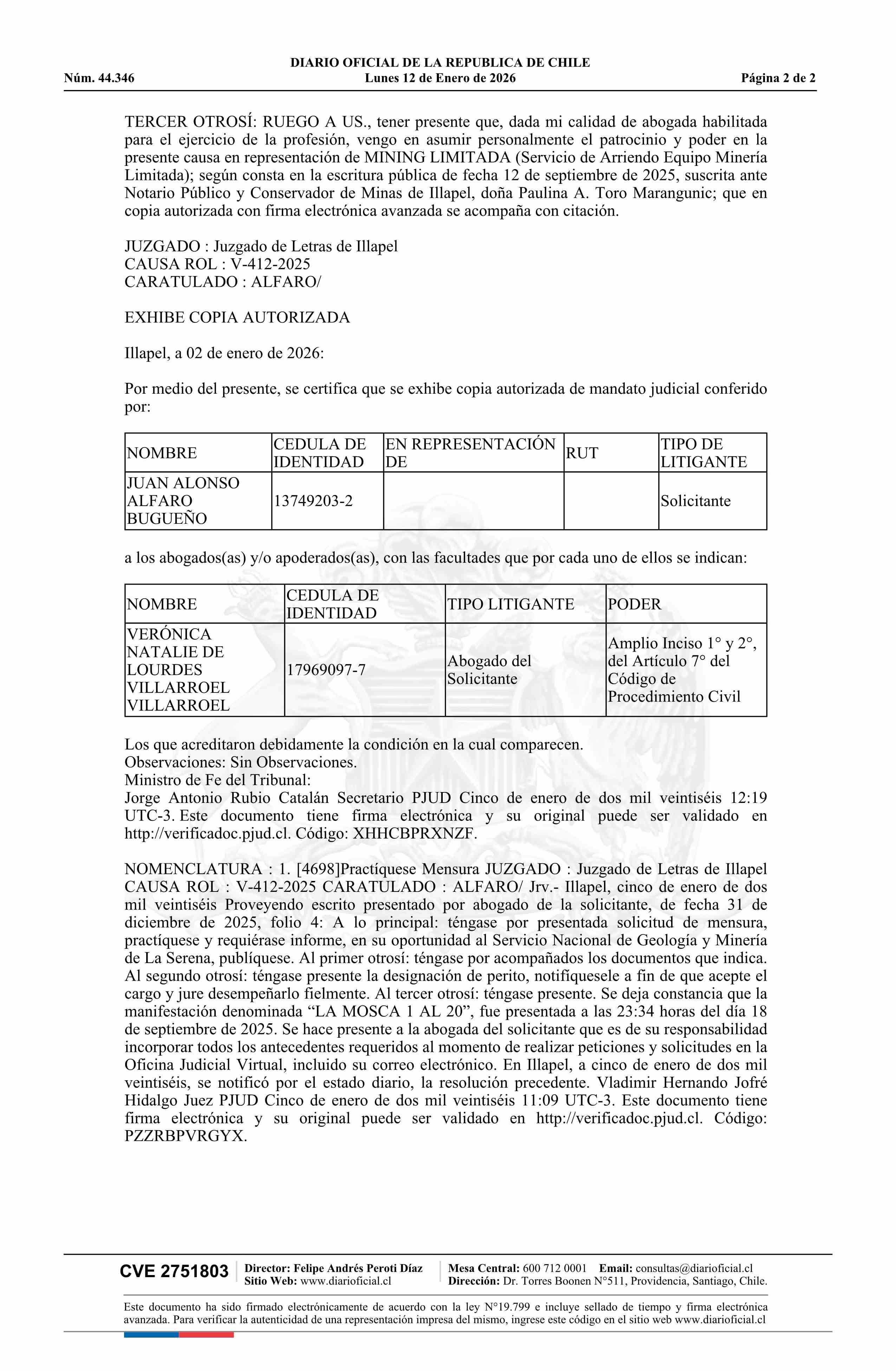 | Fuente: | DIARIO OFICIAL CHILE - BOLETÍN OFICIAL DE MINERÍA (DIARIO OFICIAL CHILE – BOM – SOLICITUDES DE MENSUR) | Página(s): | 1-2 |