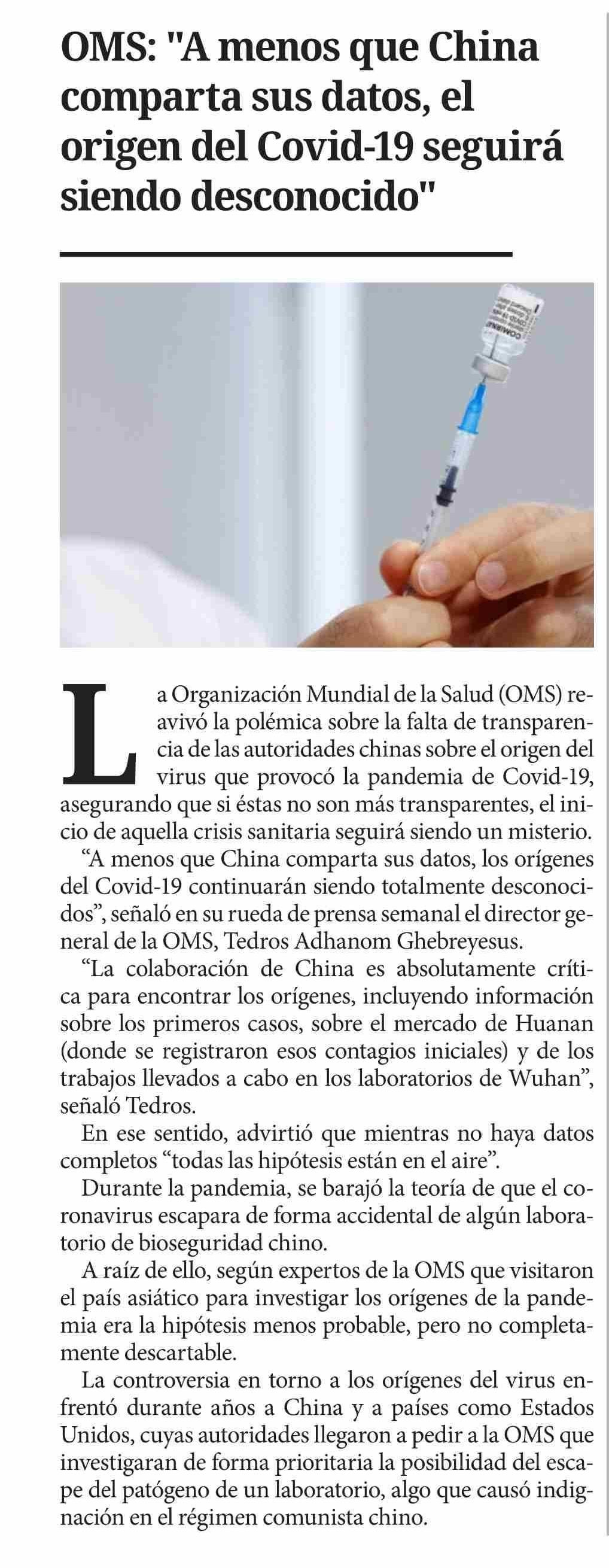 | Título: | OMS: "A menos que China comparta sus datos, el origen del Covid-19 seguirá siendo desconocido" |