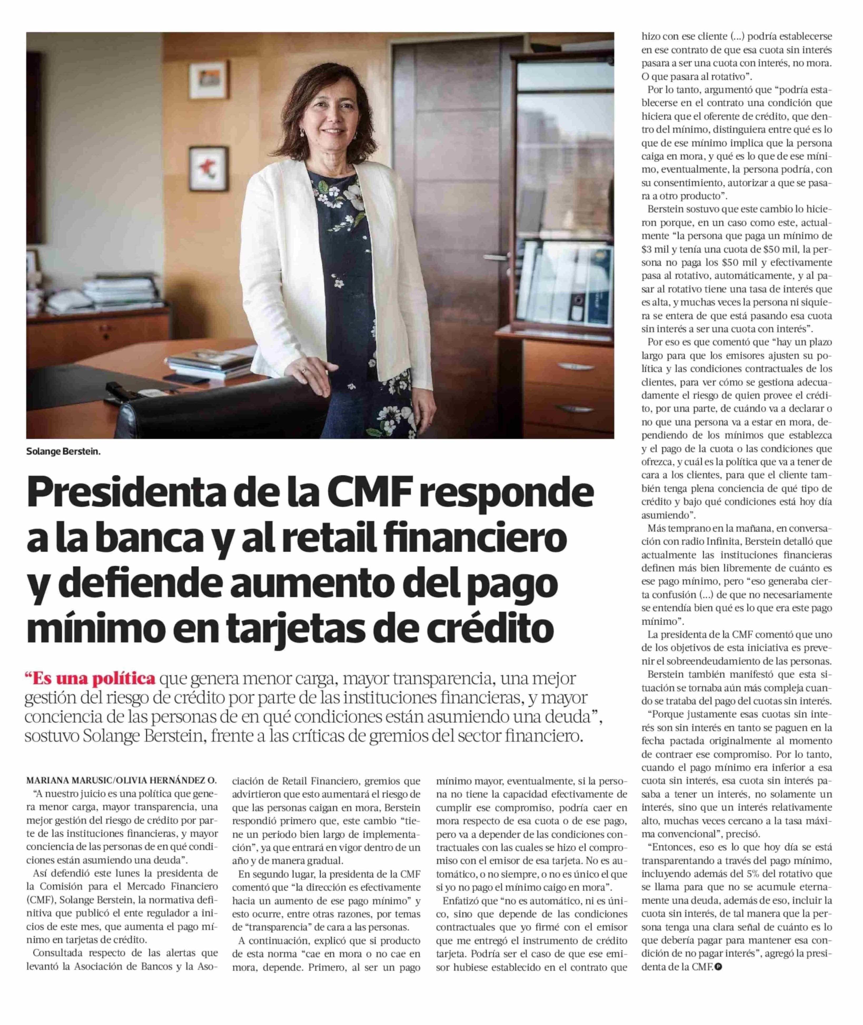 Título: Presidenta de la CMF responde a la banca y al retail financiero y defiende aumento del pago mínimo en tarjetas de crédito