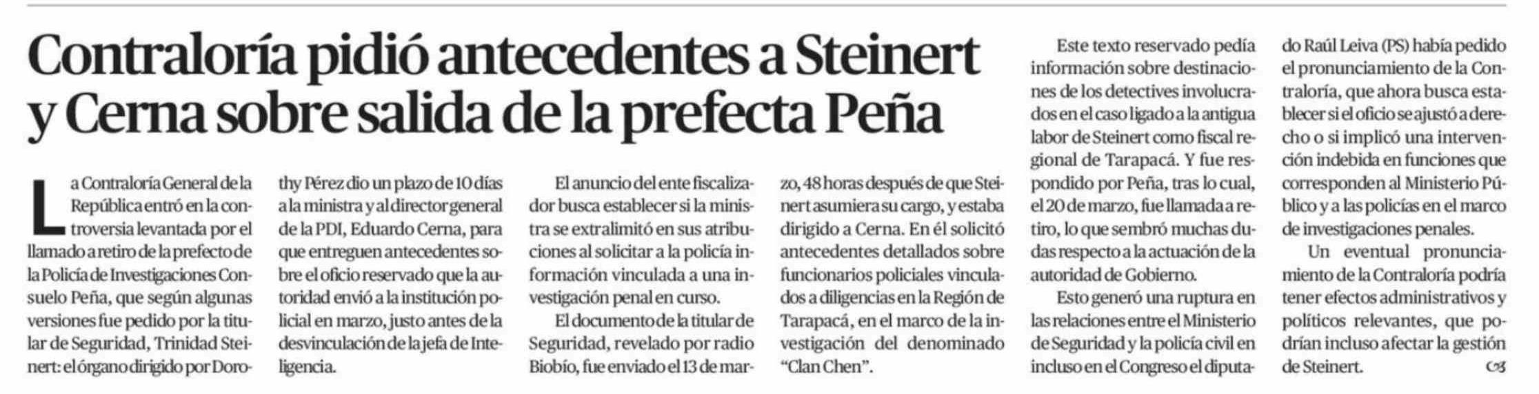 Título: Contraloría pidió antecedentes a Steinert y Cerna sobre salida de la prefecta Peña