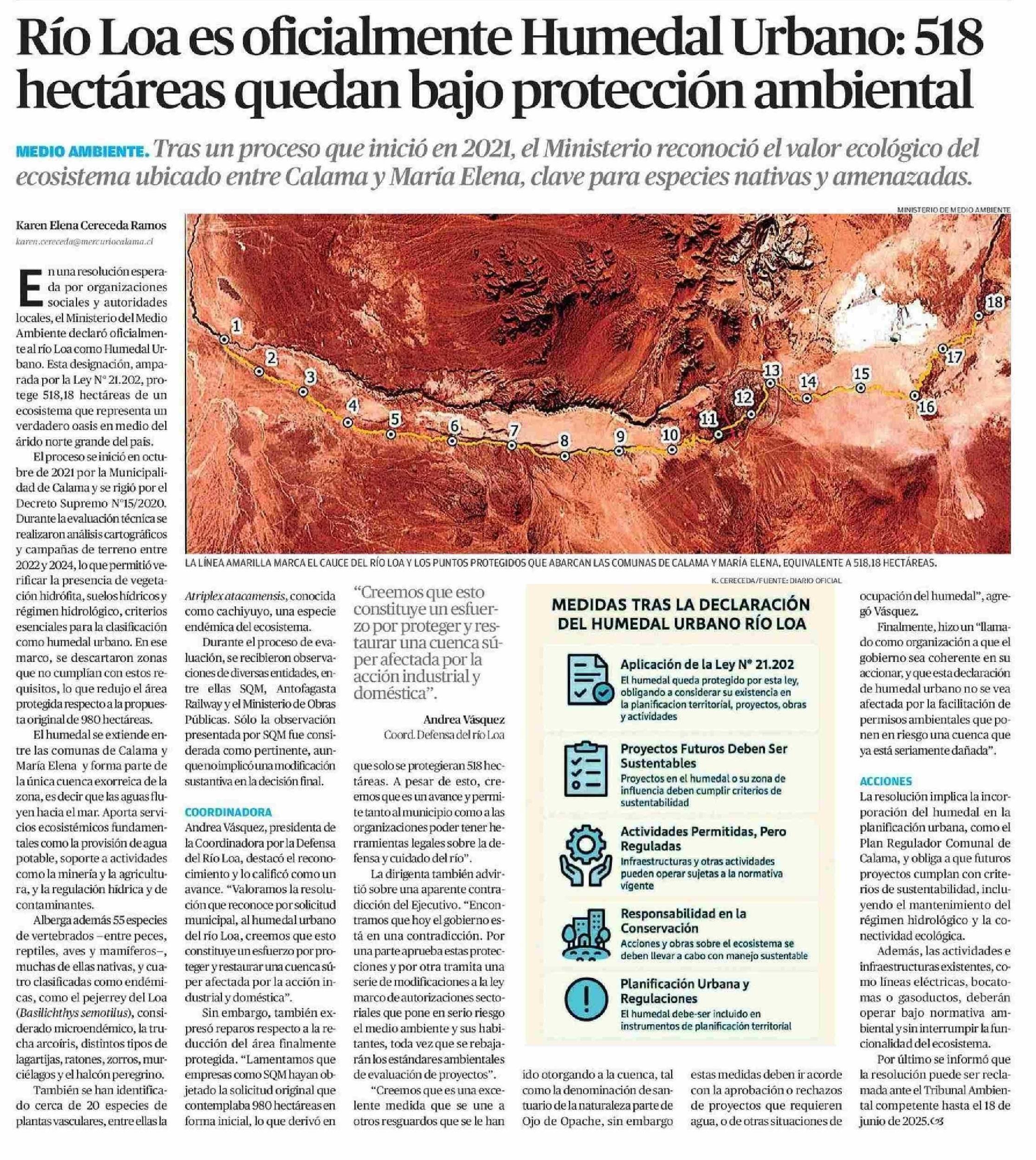 Río Loa es oficialmente Humedal Urbano: 518 hectáreas quedan bajo protección ambiental 23-05-2025 El Mercurio de Antofagasta |