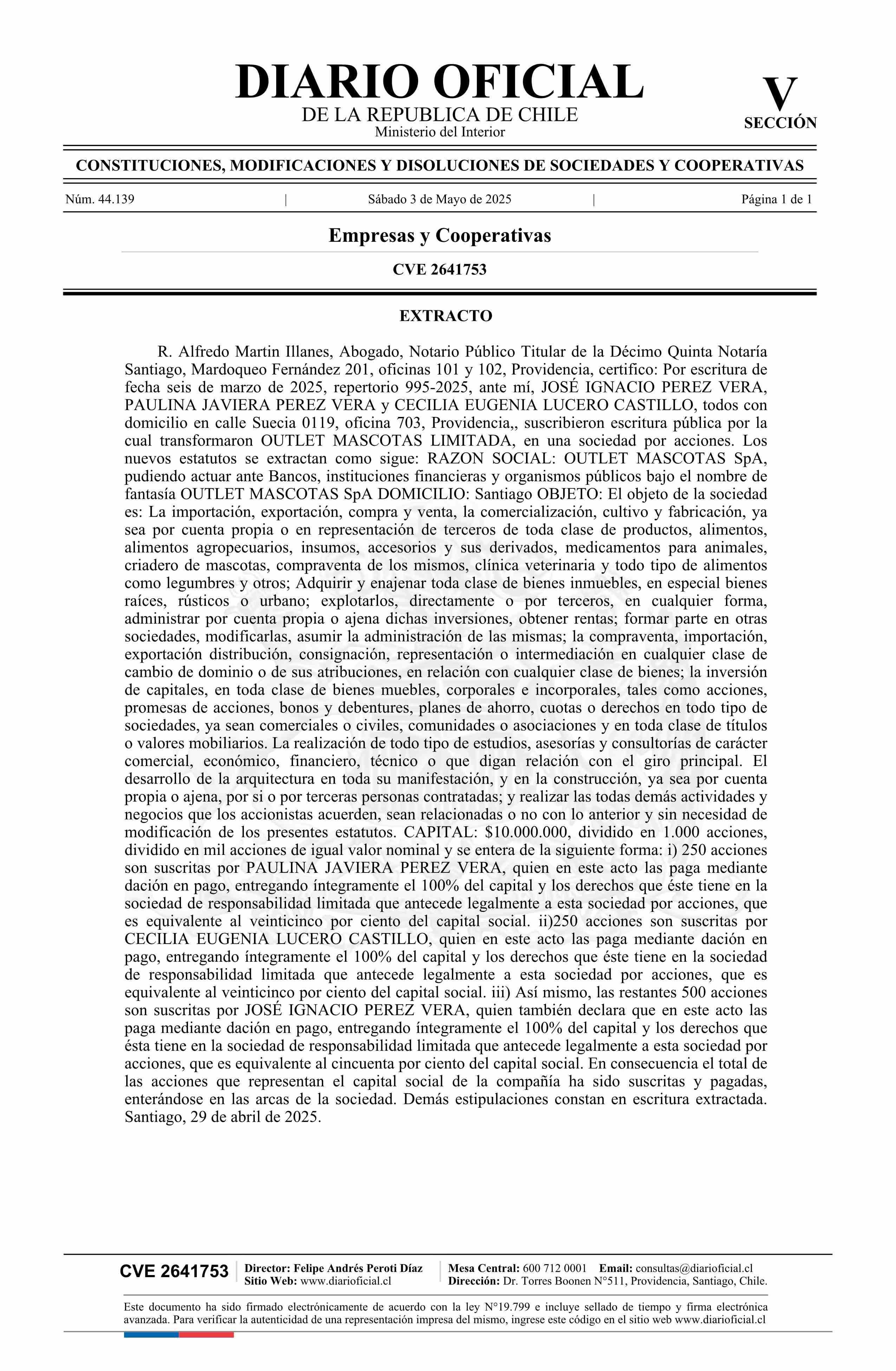 Outlet Mascotas Limitada 76.646.690-7* 03-05-2025 Diario Oficial Edición Electrónica |