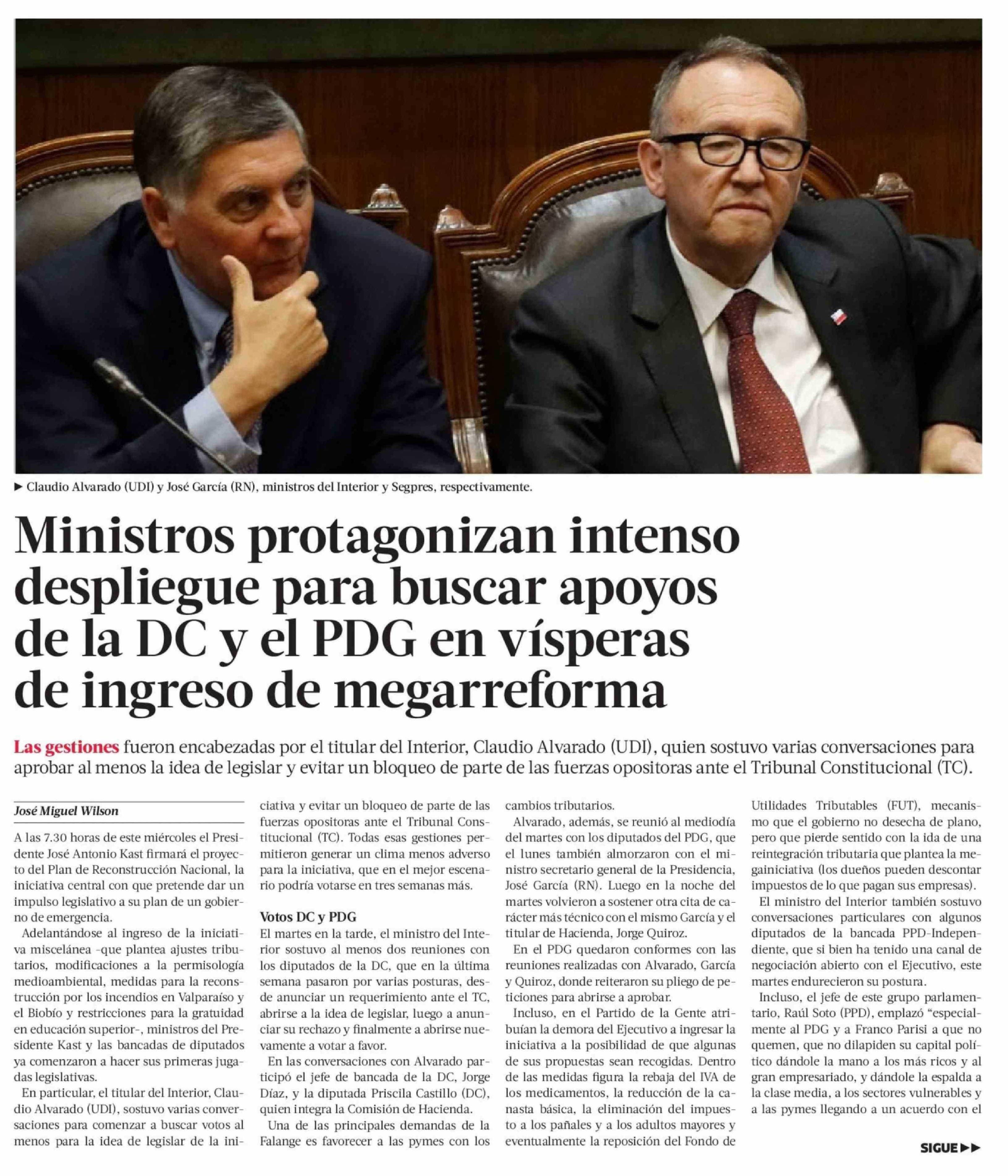 Ministros protagonizan intenso despliegue para buscar apoyos de la DC y el PDG en vísperas de ingreso de megarreforma 22-04-2026 La Tercera |