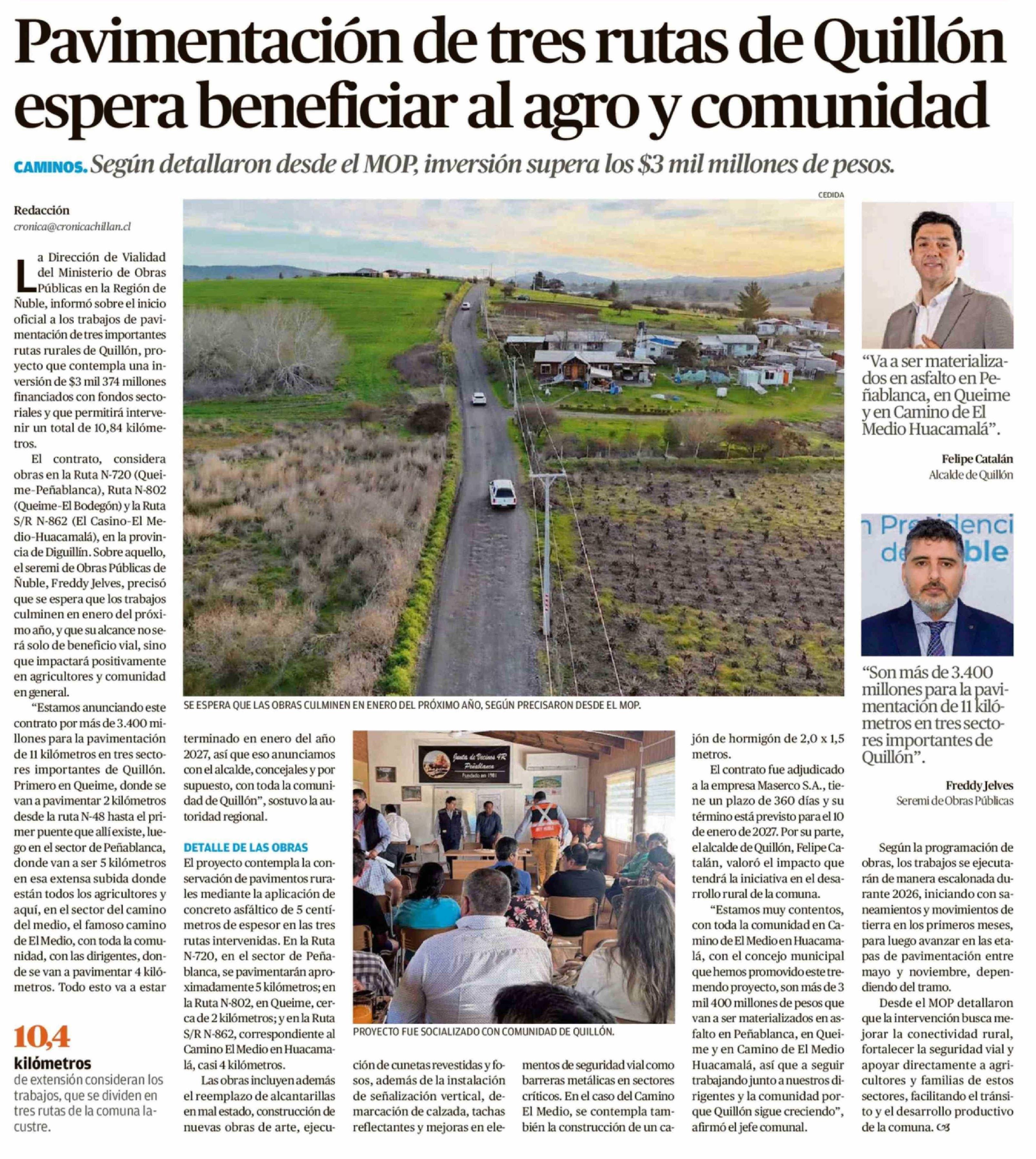 Título: Pavimentación de tres rutas de Quillón espera beneficiar al agro y comunidad