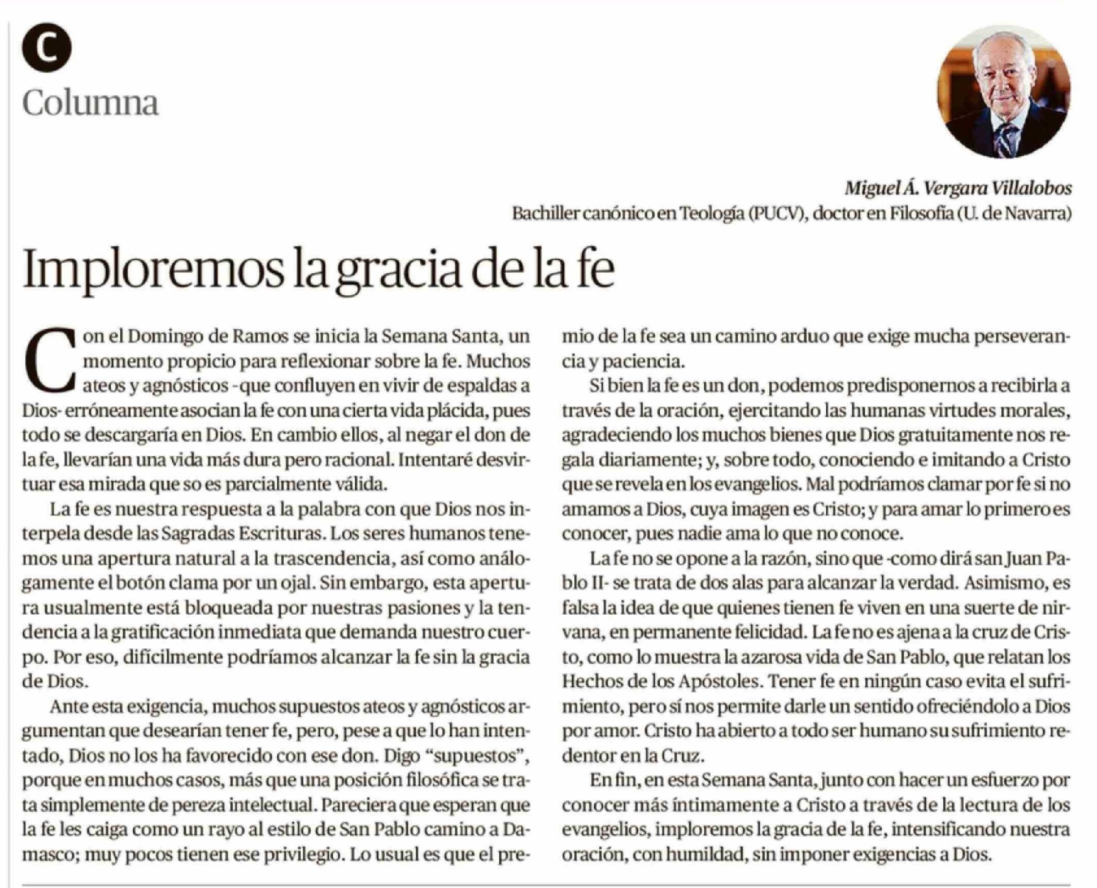 Título: Columnas de Opinión: Imploremos la gracia de la fe