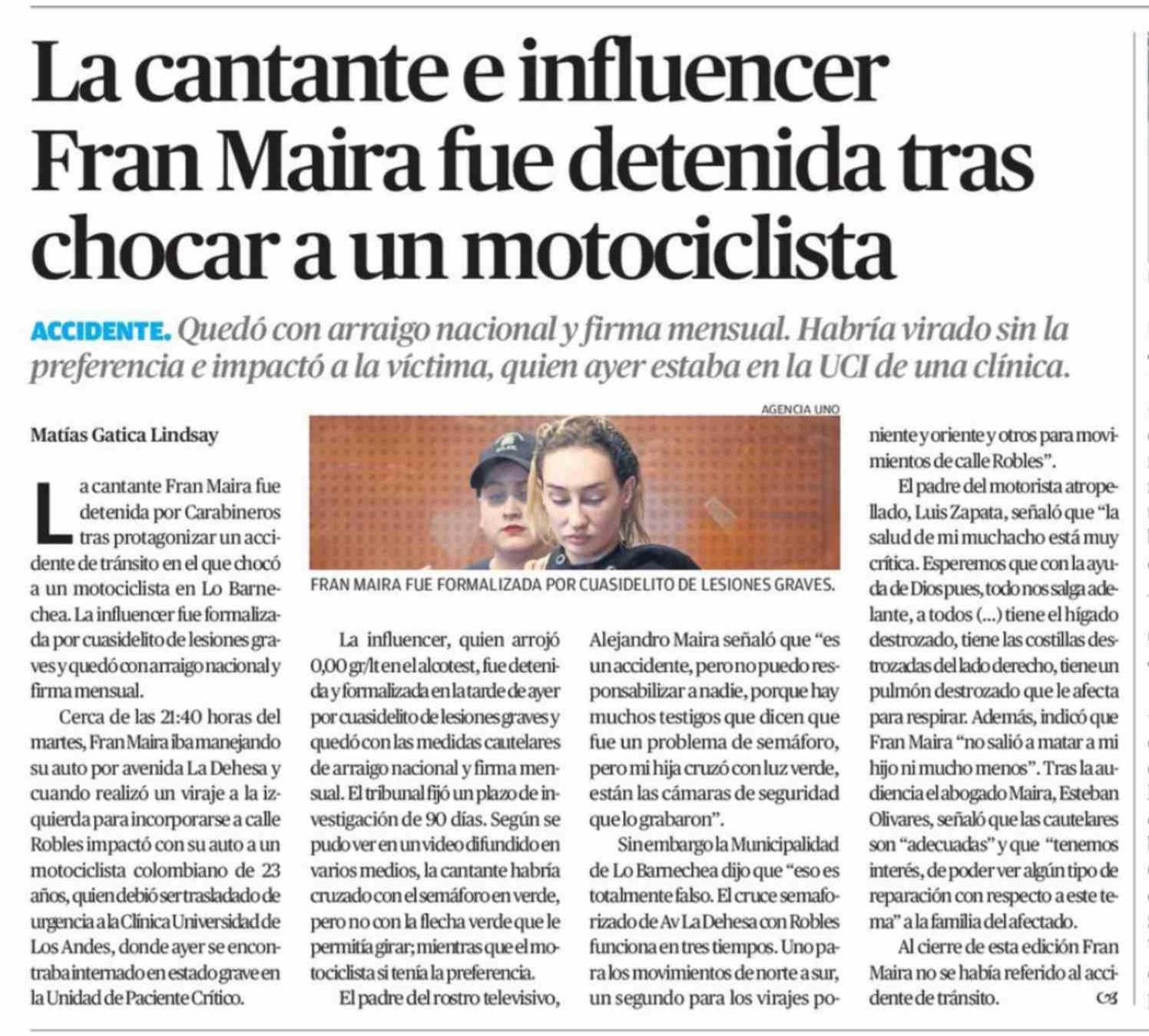 La cantante e influencer Fran Maira fue detenida tras chocar a un motociclista 26-02-2026 El Diario de Atacama |