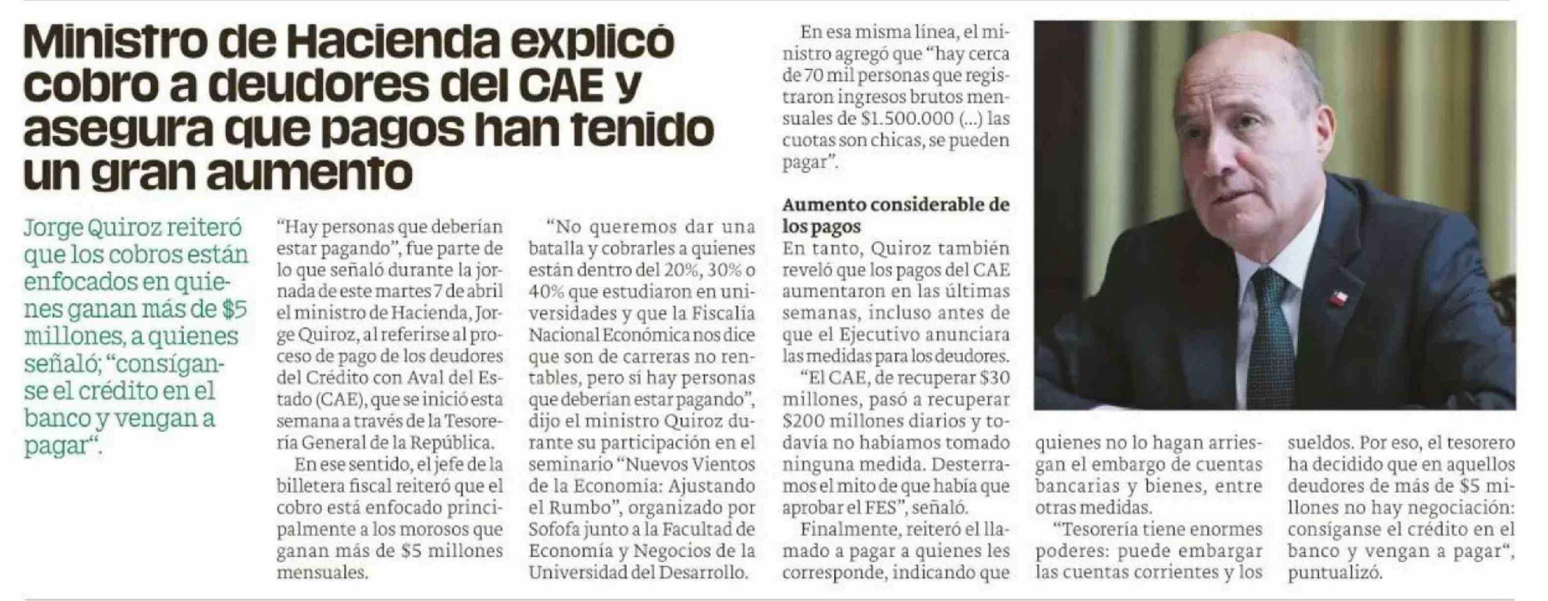 Título: Ministro de Hacienda explico cobro a deudores del CAE y asegura que pagos han tenido un gran aumento