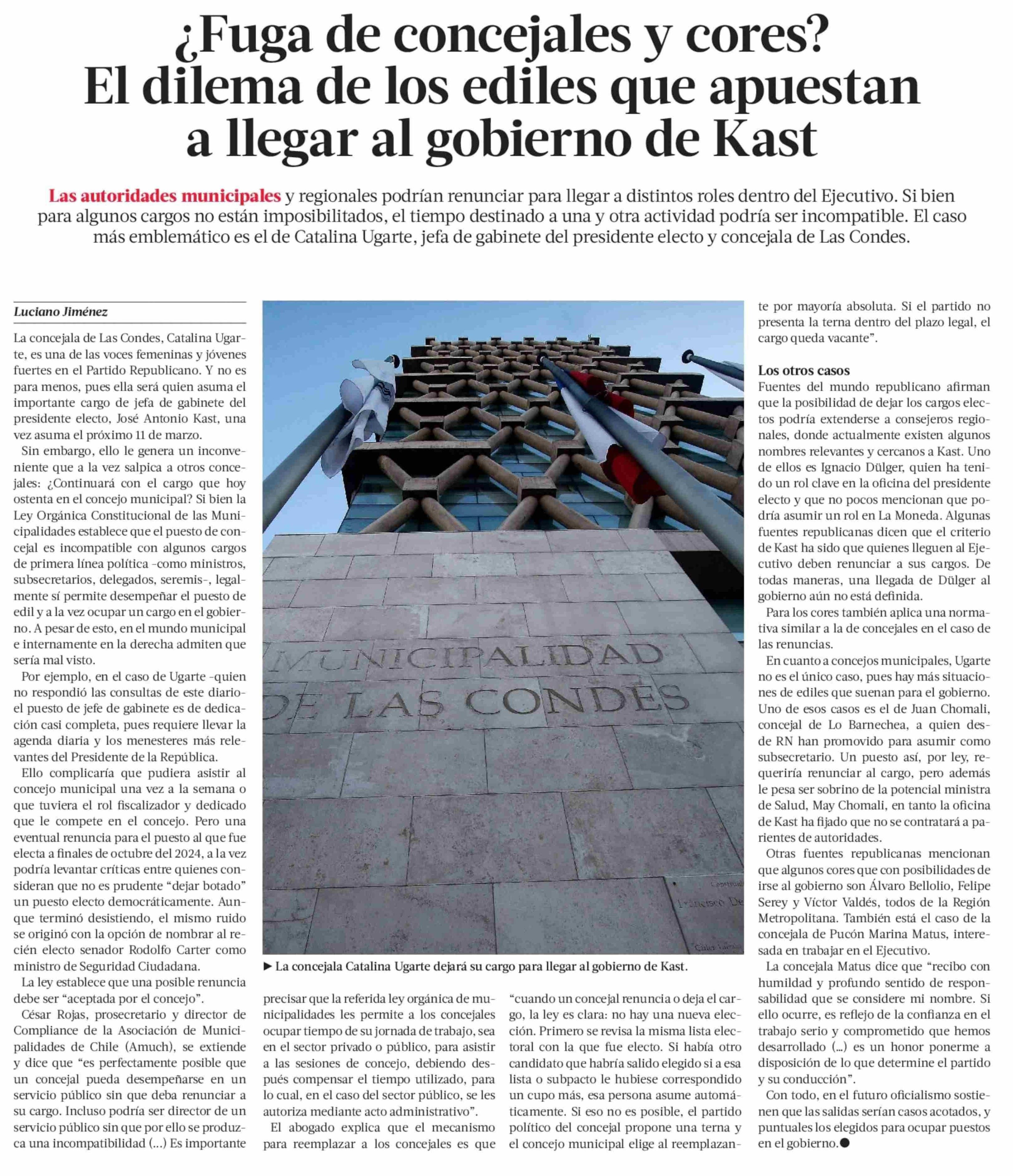 ;Fuga de concejales y cores? El dilema de los ediles que apuestan a llegar al gobierno de Kast 16-01-2026 La Tercera |