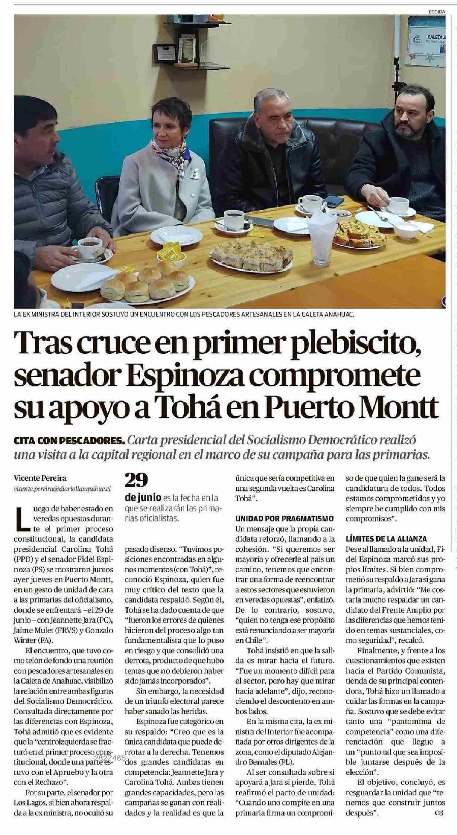 | Título: | Tras cruce en primer plebiscito, senador Espinoza compromete su apoyo a Tohá en Puerto Montt |