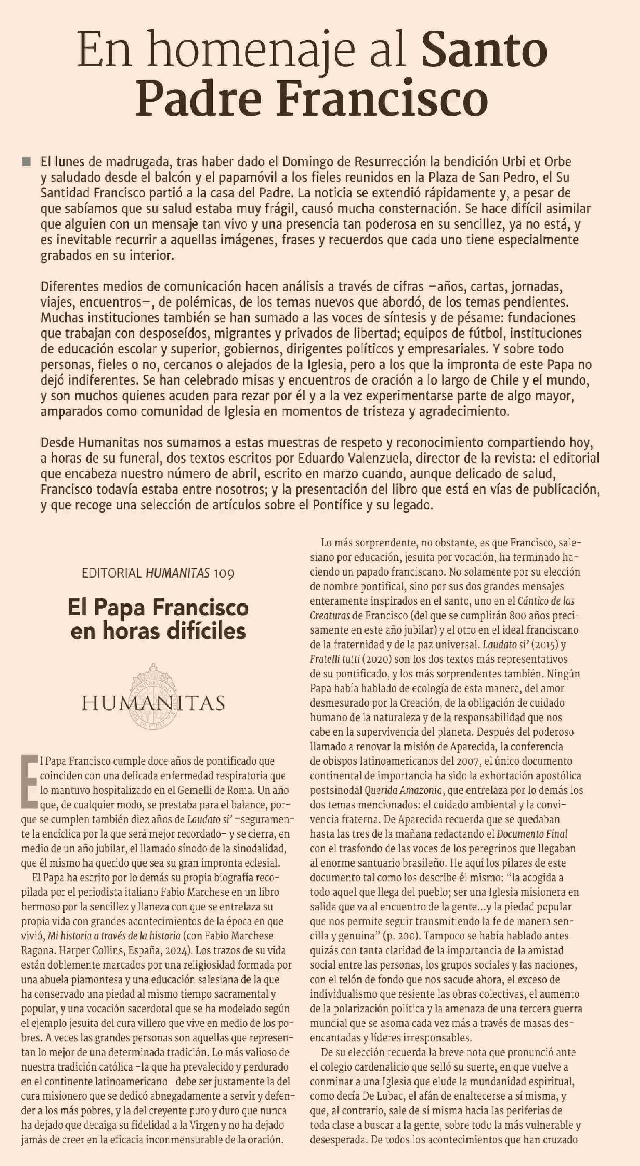 En homenaje al Santo Padre Francisco 25-04-2025 Diario Financiero |