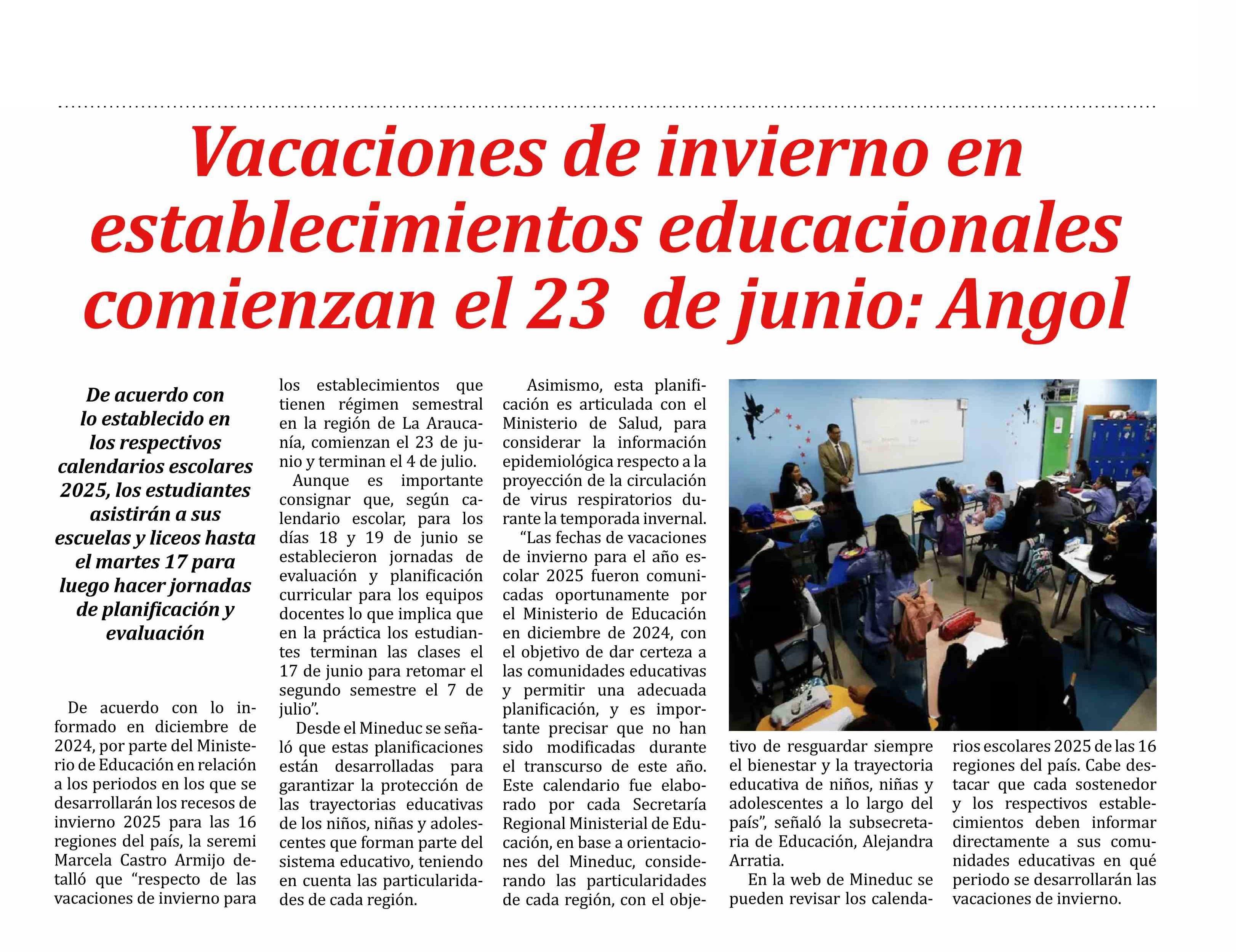 | Título: | Vacaciones de invierno en establecimientos educacionales comienzan el 23 de junio: Angol |