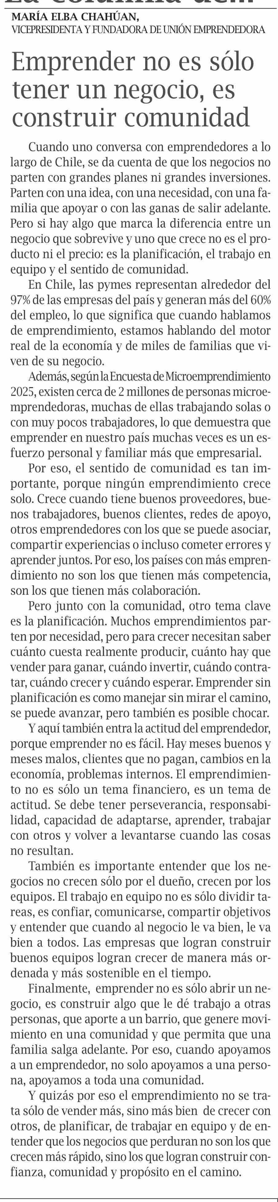 Columnas de Opinión: Emprender no es sólo tener un negocio, es construir comunidad 15-04-2026 El Pingüino |