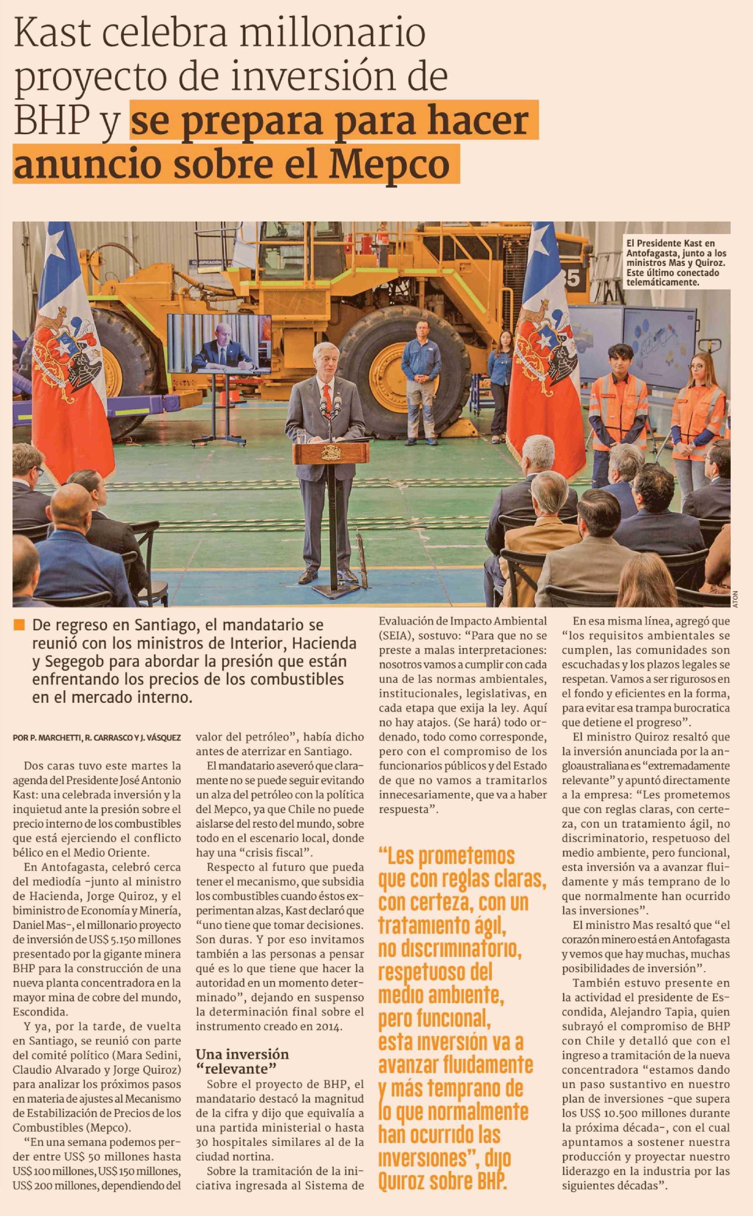 Título: Kast celebra millonario proyecto de inversión de BHP y se prepara para hacer anuncio sobre el Mepco