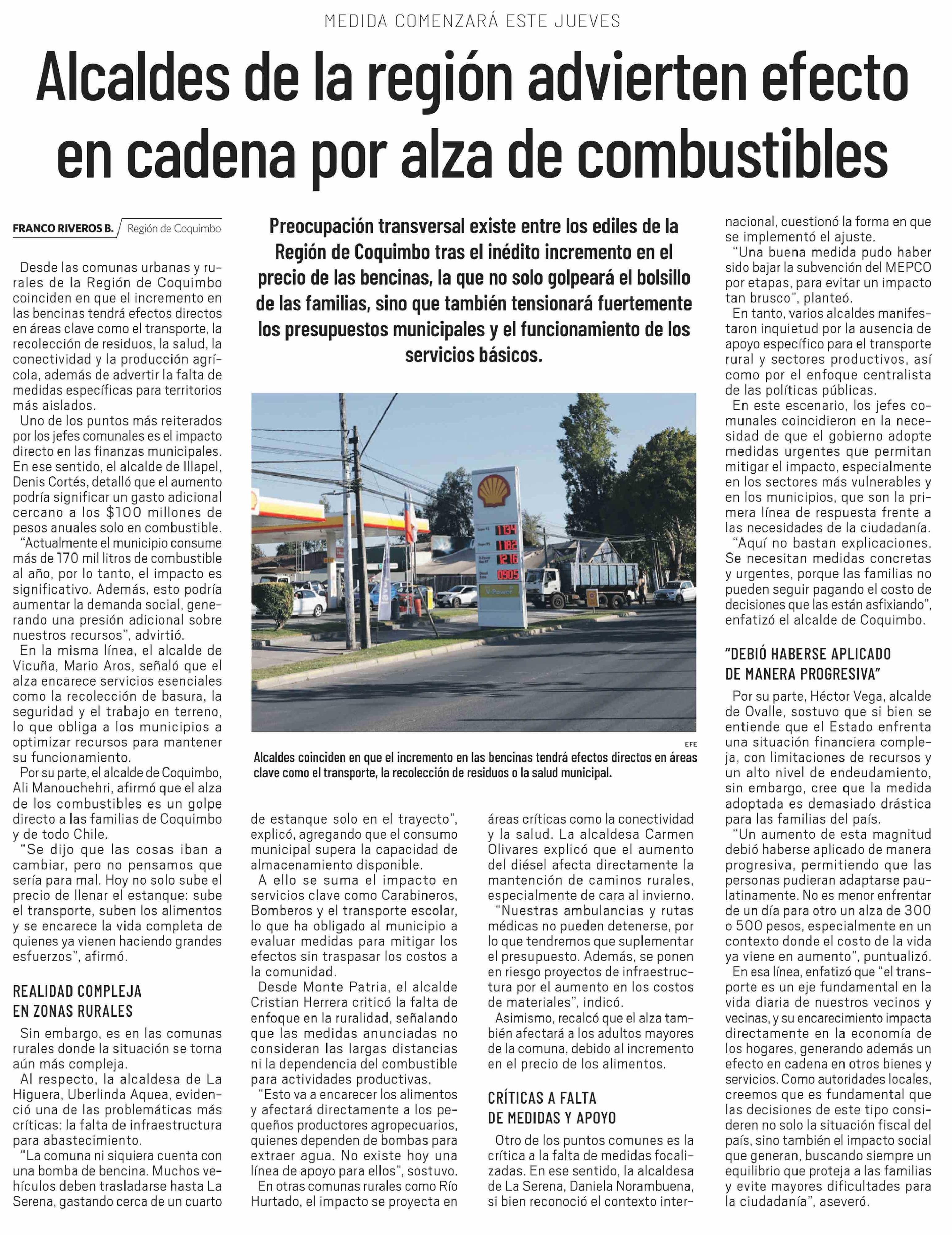 Título: Alcaldes de la región advierten efecto en cadena por alza de combustibles