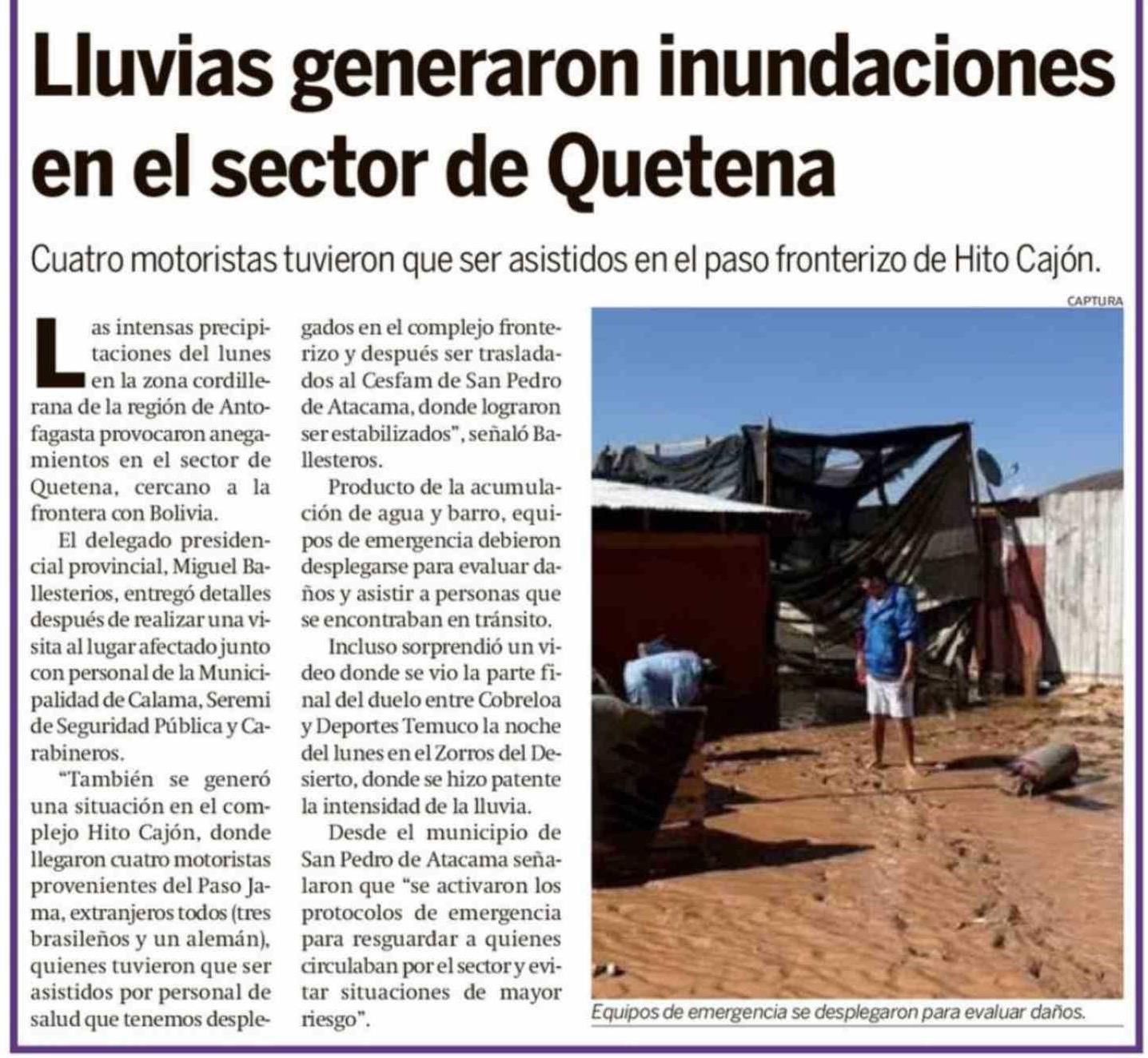 | Título: | Lluvias generaron inundaciones en el sector de Quetena |